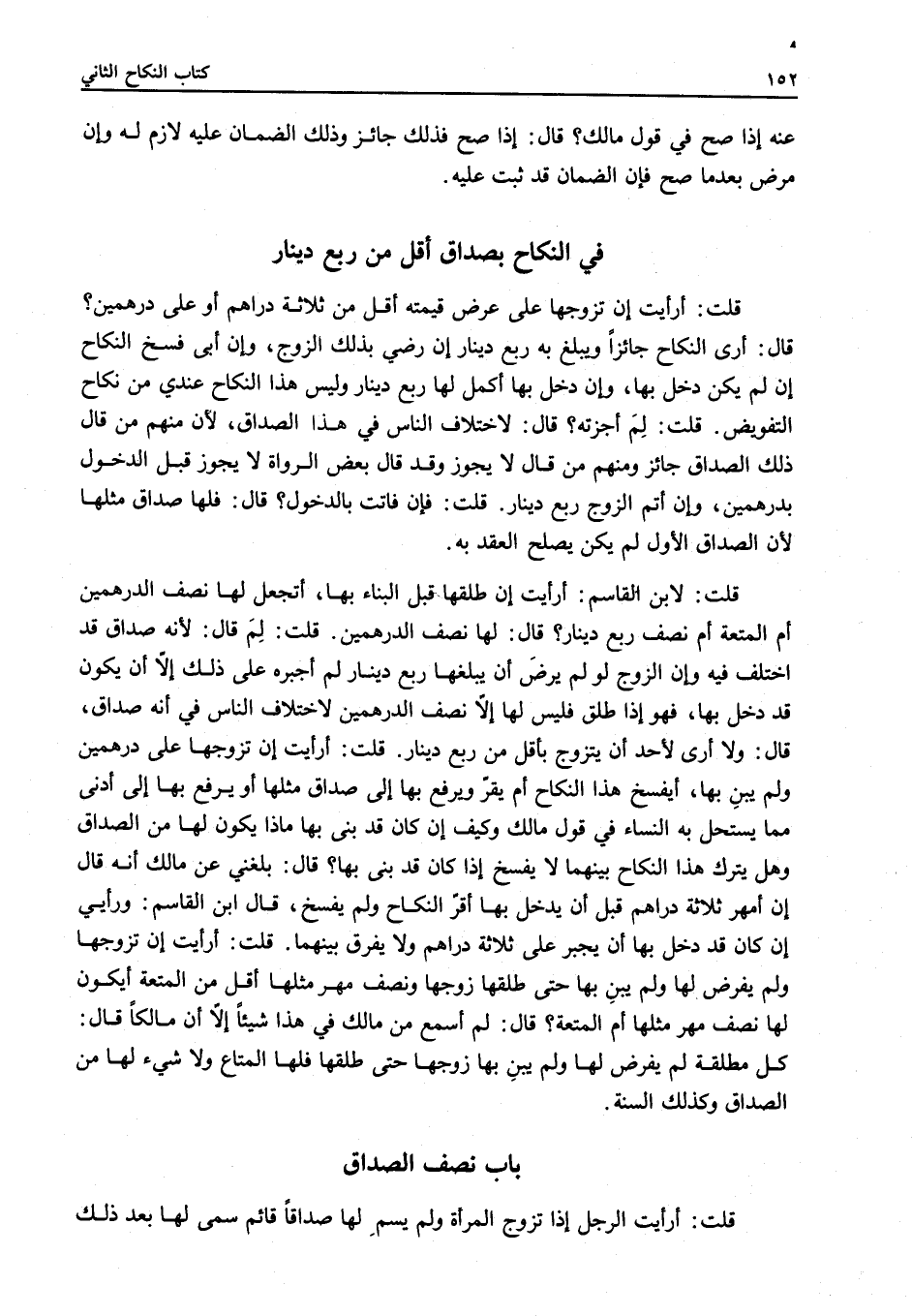 فِي النِّكَاحِ بِصَدَاقٍ أَقَلَّ مِنْ رُبْعِ دِينَارٍ قُلْتُ: أَرَأَيْتَ إنْ تَزَوَّجَهَا عَلَى عَرَضٍ قِيمَتِهِ أَقَلُّ مِنْ ثَلَاثَةِ دَرَاهِمَ أَوْ عَلَى دِرْهَمَيْنِ؟ قَالَ: أَرَى النِّكَاحَ جَائِزًا وَيَبْلُغُ بِهِ رُبْعَ دِينَارٍ إنْ رَضِيَ بِذَلِكَ الزَّوْجُ، وَإِنْ أَبَى فُسِخَ النِّكَاحُ إنْ لَمْ يَكُنْ دَخَلَ بِهَا، وَإِنْ دَخَلَ بِهَا أَكْمَلَ لَهَا رُبْعَ دِينَارٍ وَلَيْسَ هَذَا النِّكَاحُ عِنْدِي مِنْ نِكَاحِ التَّفْوِيضِ قُلْتُ: لِمَ أَجَزْته؟