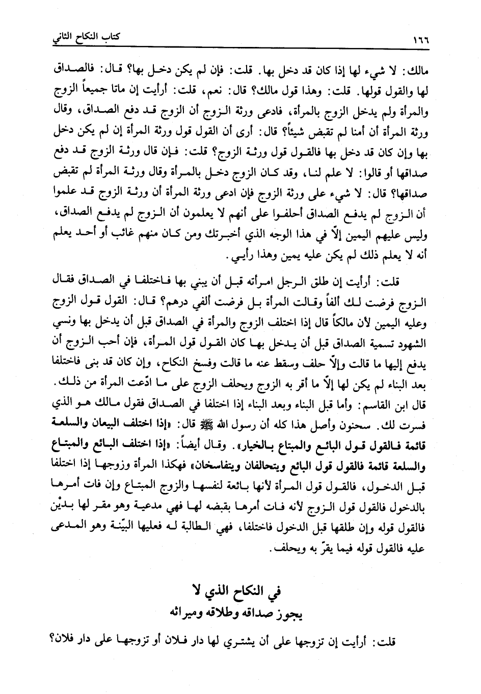 فِي النِّكَاحِ الَّذِي لَا يَجُوزُ صَدَاقُهُ وَطَلَاقُهُ وَمِيرَاثُهُ قُلْتُ: أَرَأَيْتَ إنْ تَزَوَّجَهَا عَلَى أَنْ يَشْتَرِيَ لَهَا دَارَ فُلَانٍ أَوْ تَزَوَّجَهَا عَلَى دَارِ فُلَانٍ؟