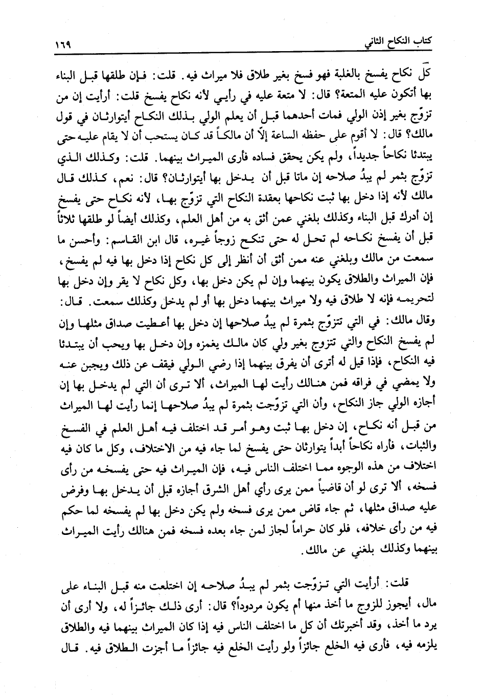 قَالَ: وَقَالَ مَالِكٌ: فِي الَّتِي تَتَزَوَّجُ بِثَمَرَةٍ لَمْ يَبْدُ صَلَاحُهَا إنْ دَخَلَ بِهَا أُعْطِيت صَدَاقَ مِثْلِهَا وَإِنْ لَمْ يُفْسَخْ النِّكَاحُ وَاَلَّتِي تَتَزَوَّجُ بِغَيْرِ وَلِيٍّ كَانَ مَالِكٌ يَغْمِزُهُ وَإِنْ دَخَلَ بِهَا وَيُحِبُّ أَنْ يَبْتَدِئَا فِيهِ النِّكَاحُ، فَإِذَا قِيلَ لَهُ أَتَرَى أَنْ يُفَرَّقَ بَيْنَهُمَا إذَا رَضِيَ الْوَلِيُّ فَيَقِفُ عَنْ ذَلِكَ وَيَجْبُنُ عَنْهُ وَلَا يَمْضِي فِي فِرَاقِهِ فَمِنْ هُنَالِكَ رَأَيْتُ لَهَا الْمِيرَاثَ، أَلَا تَرَى أَنَّ الَّتِي لَمْ يَدْخُلْ بِهَا إنْ أَجَازَهُ الْوَلِيُّ جَازَ النِّكَاحُ، وَأَنَّ الَّتِي تَزَوَّجَتْ بِثَمَرَةٍ لَمْ يَبْدُ صَلَاحُهَا إنَّمَا رَأَيْتُ لَهَا الْمِيرَاثَ مِنْ قِبَلِ أَنَّهُ نِكَاحٌ إنْ دَخَلَ بِهَا ثَبَتَ، وَهُوَ أَمْرٌ قَدْ اخْتَلَفَ فِيهِ أَهْلُ الْعِلْمِ فِي الْفَسْخِ وَالثَّبَاتِ، فَأَرَاهُ نِكَاحًا أَبَدًا يَتَوَارَثَانِ حَتَّى يُفْسَخَ لِمَا جَاءَ فِيهِ مِنْ الِاخْتِلَافِ، وَكُلُّ مَا كَانَ فِيهِ اخْتِلَافٌ مِنْ هَذِهِ الْوُجُوهِ مِمَّا اخْتَلَفَ النَّاسُ فِيهِ، فَإِنَّ الْمِيرَاثَ فِيهِ حَتَّى يَفْسَخَهُ مَنْ رَأَى فَسْخَهُ، أَلَا تَرَى لَوْ أَنَّ قَاضِيًا مِمَّنْ يَرَى رَأْيَ أَهْلِ الشَّرْقِ أَجَازَهُ قَبْلَ أَنْ يَدْخُلَ بِهَا وَفُرِضَ عَلَيْهِ صَدَاقُ مِثْلِهَا، ثُمَّ جَاءَ قَاضٍ مِمَّنْ يَرَى فَسْخَهُ وَلَمْ يَكُنْ دَخَلَ بِهَا لَمْ يَفْسَخْهُ لِمَا حَكَمَ فِيهِ مَنْ رَأَى خِلَافَهُ، فَلَوْ كَانَ حَرَامًا لَجَازَ لِمَنْ جَاءَ بَعْدَهُ فَسْخُهُ، فَمِنْ هُنَالِكَ رَأَيْتُ الْمِيرَاثَ بَيْنَهُمَا وَكَذَلِكَ بَلَغَنِي عَنْ مَالِكٍ