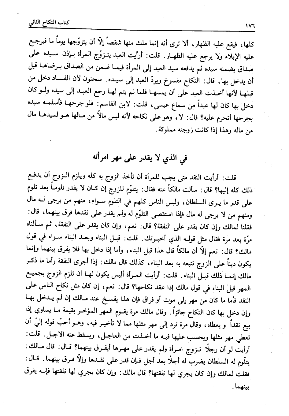 قُلْتُ: أَرَأَيْتَ لَوْ أَنَّ رَجُلًا تَزَوَّجَ امْرَأَةً وَلَمْ يَقْدِرْ عَلَى مَهْرِهَا أَيُفَرَّقُ بَيْنَهُمَا؟
