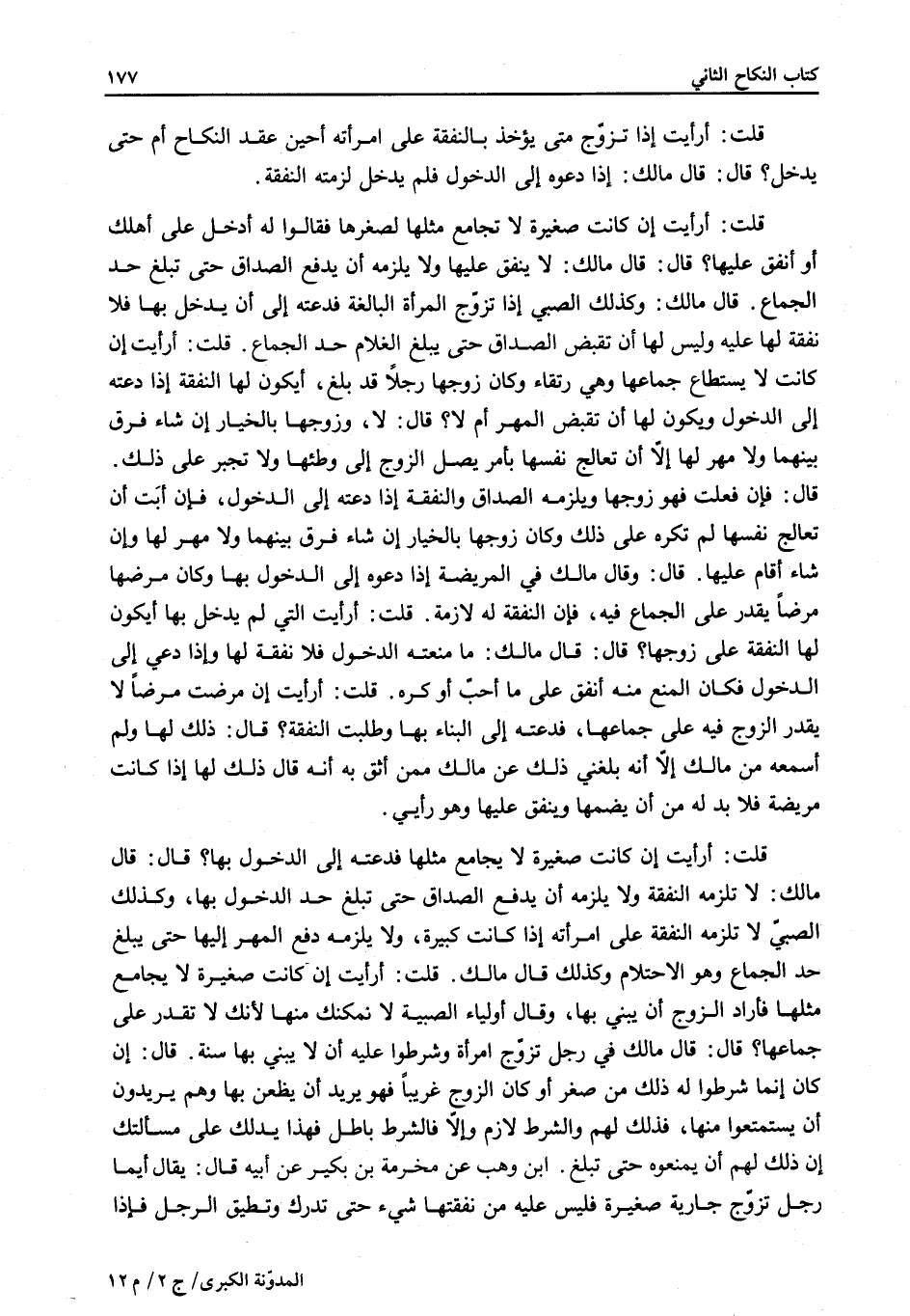 قَالَ: قَالَ مَالِكٌ: لَا تَلْزَمُهُ النَّفَقَةُ وَلَا يَلْزَمُهُ أَنْ يَدْفَعَ الصَّدَاقَ حَتَّى تَبْلُغَ حَدَّ الدُّخُولِ بِهَا، وَكَذَلِكَ الصَّبِيُّ لَا تَلْزَمُهُ النَّفَقَةُ عَلَى امْرَأَتِهِ إذَا كَانَتْ كَبِيرَةً وَلَا يَلْزَمُهُ دَفْعُ الْمَهْرِ إلَيْهَا حَتَّى يَبْلُغَ حَدَّ الْجِمَاعِ وَهُوَ الِاحْتِلَامُ وَكَذَلِكَ قَالَ مَالِكٌ.