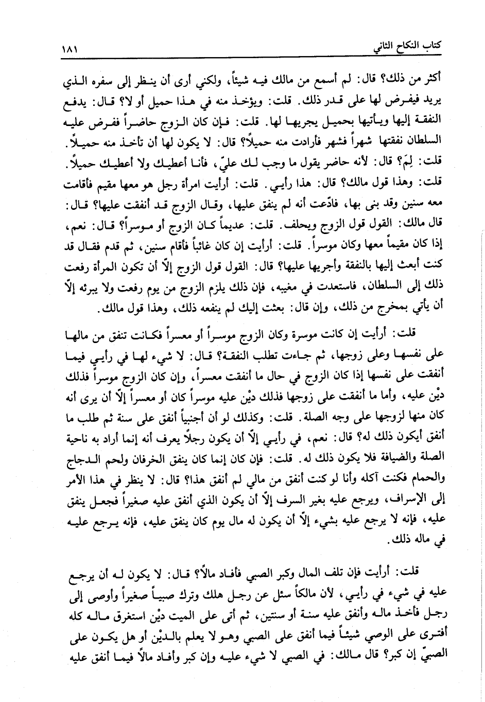 قُلْتُ: أَرَأَيْتَ إنْ كَانَتْ مُوسِرَةً وَكَانَ الزَّوْجُ مُوسِرًا أَوْ مُعْسِرًا فَكَانَتْ تُنْفِقُ مِنْ مَالِهَا عَلَى نَفْسِهَا وَعَلَى زَوْجِهَا، ثُمَّ جَاءَتْ تَطْلُبُ النَّفَقَةَ؟