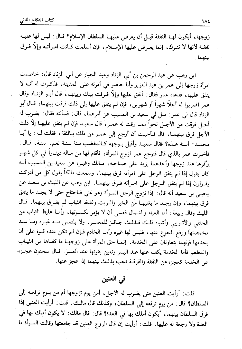 ابْنُ وَهْبٍ عَنْ عَبْدِ الرَّحْمَنِ بْنِ أَبِي الزِّنَادِ وَعَبْدِ الْجَبَّارِ عَنْ أَبِي الزِّنَادِ قَالَ: خَاصَمَتْ امْرَأَةٌ زَوْجَهَا إلَى عُمَرَ بْنِ عَبْدِ الْعَزِيزِ وَأَنَا حَاضِرٌ فِي إمْرَتِهِ عَلَى الْمَدِينَةِ، فَذَكَرَتْ لَهُ أَنَّهُ لَا يُنْفِقُ عَلَيْهَا، فَدَعَاهُ عُمَرُ فَقَالَ: أَنْفِقْ عَلَيْهَا وَإِلَّا فَرَّقْتُ بَيْنَك وَبَيْنَهَا. قَالَ أَبُو الزِّنَادِ وَقَالَ عُمَرُ اضْرِبُوا لَهُ أَجَلًا شَهْرًا أَوْ شَهْرَيْنِ، فَإِنْ لَمْ يُنْفِقْ عَلَيْهَا إلَى ذَلِكَ فَرَّقْتُ بَيْنَهُمَا. قَالَ أَبُو الزِّنَادِ قَالَ لِي عُمَرُ: سَلْ لِي سَعِيدَ بْنَ الْمُسَيِّبِ عَنْ أَمْرِهِمَا، قَالَ: فَسَأَلْتُهُ فَقَالَ: يُضْرَبُ لَهُ أَجَلٌ، فَوَقَّتَ مِنْ الْأَجَلِ نَحْوًا مِمَّا وَقَّتَ لَهُ عُمَرُ، قَالَ سَعِيدٌ فَإِنْ لَمْ يُنْفِقْ عَلَيْهَا إلَى ذَلِكَ الْأَجَلِ فَرَّقَ بَيْنَهُمَا، قَالَ فَأَحْبَبْتُ أَنْ أَرْجِعَ إلَى عُمَرَ مِنْ ذَلِكَ بِالثِّقَةِ، فَقُلْتُ لَهُ: يَا أَبَا مُحَمَّدٍ: أَسُنَّةٌ هَذِهِ؟ فَقَالَ سَعِيدٌ وَأَقْبَلَ بِوَجْهِهِ كَالْمُغْضَبِ سُنَّةٌ سُنَّةٌ نَعَمْ سُنَّةٌ، قَالَ: فَأَخْبَرْتُ عُمَرَ بِاَلَّذِي قَالَ فَتَوَجَّعَ عُمَرُ لِزَوْجِ الْمَرْأَةِ، فَأَقَامَ لَهَا مِنْ مَالِهِ دِينَارًا فِي كُلِّ شَهْرٍ وَأَقَرَّهَا عِنْدَ زَوْجِهَا وَأَحَدُهُمَا يَزِيدُ عَلَى صَاحِبِهِ.