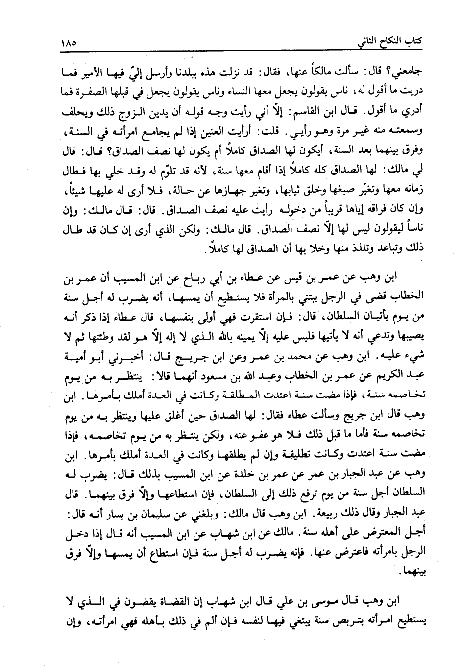 ابْنُ وَهْبٍ عَنْ عُمَرَ بْنِ قَيْسٍ عَنْ عَطَاءِ بْنِ أَبِي رَبَاحٍ عَنْ ابْنِ الْمُسَيِّبِ أَنَّ عُمَرَ بْنَ الْخَطَّابِ قَضَى فِي الرَّجُلِ يَبْتَنِي بِالْمَرْأَةِ فَلَا يَسْتَطِيعُ أَنْ يَمَسَّهَا، أَنَّهُ يُضْرَبُ لَهُ أَجَلُ سَنَةٍ مِنْ يَوْمِ يَأْتِيَانِ السُّلْطَانَ، قَالَ: فَإِنْ اسْتَقَرَّتْ فَهِيَ أَوْلَى بِنَفْسِهَا، قَالَ عَطَاءٌ إذَا ذَكَر أَنَّهُ يُصِيبُهَا وَتَدَّعِي أَنَّهُ لَا يَأْتِيهَا فَلَيْسَ عَلَيْهِ إلَّا يَمِينُهُ بِاَللَّهِ الَّذِي لَا إلَهَ إلَّا هُوَ لَقَدْ وَطِئْتُهَا ثُمَّ لَا شَيْءَ عَلَيْهِ. ابْنُ وَهْبٍ عَنْ مُحَمَّدِ بْنِ عُمَرَ وَعَنْ ابْنِ جُرَيْجٍ قَالَ: أَخْبَرَنِي أَبُو أُمَيَّةَ عَبْدُ الْكَرِيمِ عَنْ عُمَرَ بْنِ الْخَطَّابِ وَعَبْدِ اللَّهِ بْنِ مَسْعُودٍ أَنَّهُمَا قَالَا: يُنْتَظَرُ بِهِ مِنْ يَوْمِ تَخَاصُمِهِ سَنَةً، فَإِذَا مَضَتْ سَنَةٌ اعْتَدَّتْ الْمُطَلَّقَةُ وَكَانَتْ فِي الْعِدَّةِ أَمْلَكَ بِأَمْرِهَا. ابْنُ وَهْبٍ قَالَ ابْنُ جُرَيْجٍ وَسَأَلْتُ عَطَاءً فَقَالَ: لَهَا الصَّدَاقُ حِينَ أَغْلَقَ عَلَيْهَا وَيُنْتَظَرُ بِهِ مِنْ يَوْمِ تَخَاصُمِهِ سَنَةً فَأَمَّا مَا قَبْلَ ذَلِكَ فَلَا هُوَ عَفْوَ عَنْهُ، وَلَكِنْ يُنْتَظَرُ بِهِ مِنْ يَوْمِ تَخَاصُمِهِ، فَإِذَا مَضَتْ سَنَةٌ اعْتَدَّتْ وَكَانَتْ تَطْلِيقَةً وَإِنْ لَمْ يُطَلِّقْهَا، وَكَانَتْ فِي الْعِدَّةِ أَمْلَكَ بِأَمْرِهَا. ابْنُ وَهْبٍ عَنْ عَبْدِ الْجَبَّارِ بْنِ عُمَرَ عَنْ عُمَرَ بْنِ خَلْدَةَ عَنْ ابْنِ الْمُسَيِّبِ بِذَلِكَ، قَالَ: يَضْرِبُ لَهُ السُّلْطَانُ أَجَلَ سَنَةٍ مِنْ يَوْمِ تَرْفَعُ ذَلِكَ إلَى السُّلْطَانِ، فَإِنْ اسْتَطَاعَهَا وَإِلَّا فَرَّقَ بَيْنَهُمَا.