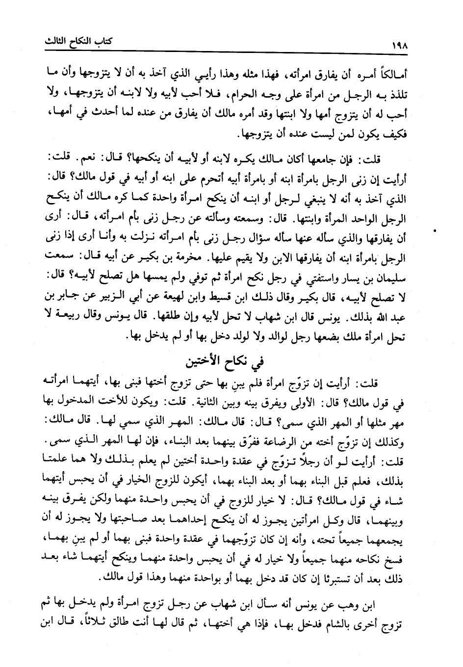 أَمَالِكًا أَمَرَهُ أَنْ يُفَارِقَ امْرَأَتَهُ، فَهَذَا مِثْلُهُ وَهَذَا رَأْيِي الَّذِي آخُذُ بِهِ أَنْ لَا يَتَزَوَّجَهَا وَأَنَّ مَا تَلَذَّذَ بِهِ الرَّجُلُ مِنْ امْرَأَةٍ عَلَى وَجْهِ الْحَرَامِ، فَلَا أُحِبُّ لِأَبِيهِ وَلَا لِابْنِهِ أَنْ يَتَزَوَّجَهَا، وَلَا أُحِبُّ لَهُ أَنْ يَتَزَوَّجَ أُمَّهَا وَلَا ابْنَتَهَا وَقَدْ أَمَرَهُ مَالِكٌ أَنْ يُفَارِقَ مَنْ عِنْدَهُ لِمَا أَحْدَثَ فِي أُمِّهَا، فَكَيْفَ يَكُونُ لِمَنْ لَيْسَتْ عِنْدَهُ أَنْ يَتَزَوَّجَهَا.