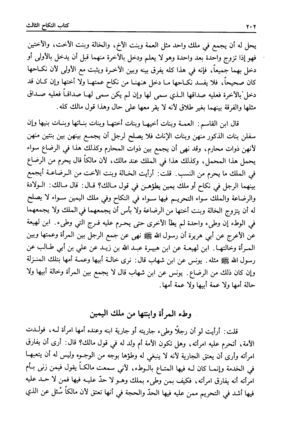 قَالَ ابْنُ الْقَاسِمِ: الْعَمَّةُ وَبَنَاتُ أَخِيهَا وَبَنَاتُ أُخْتِهَا وَبَنَاتُ بَنَاتِهَا وَبَنَاتُ بَنِيهَا وَإِنْ سَفَلْنَ بَنَاتُ الذُّكُورِ مِنْهُنَّ وَبَنَاتُ الْإِنَاثِ فَلَا يَصْلُحُ لِرَجُلٍ أَنْ يَجْمَعَ بَيْنَهُنَّ بَيْنَ بِنْتَيْنِ مِنْهُنَّ؛ لِأَنَّهُنَّ ذَوَاتُ مَحَارِمَ، وَقَدْ نَهَى أَنْ يُجْمَعَ بَيْنَ ذَوَاتِ الْمَحَارِمِ، وَكَذَلِكَ هَذَا فِي الرَّضَاعِ سَوَاءٌ يُحْمَلُ هَذَا الْمَحْمَلُ، وَكَذَلِكَ هَذَا فِي الْمِلْكِ عِنْدَ مَالِكٍ؛ لِأَنَّ مَالِكًا قَالَ يَحْرُمُ مِنْ الرَّضَاعِ فِي الْمِلْكِ مَا يَحْرُمُ مِنْ النَّسَبِ، قُلْتُ: أَرَأَيْتَ الْخَالَةَ وَبِنْتَ الْأُخْتِ مِنْ الرَّضَاعَةِ أَيَجْمَعُ بَيْنَهُمَا الرَّجُلُ فِي نِكَاحٍ أَوْ مِلْكِ يَمِينٍ يَطَؤُهُنَّ فِي قَوْلِ مَالِكٍ؟