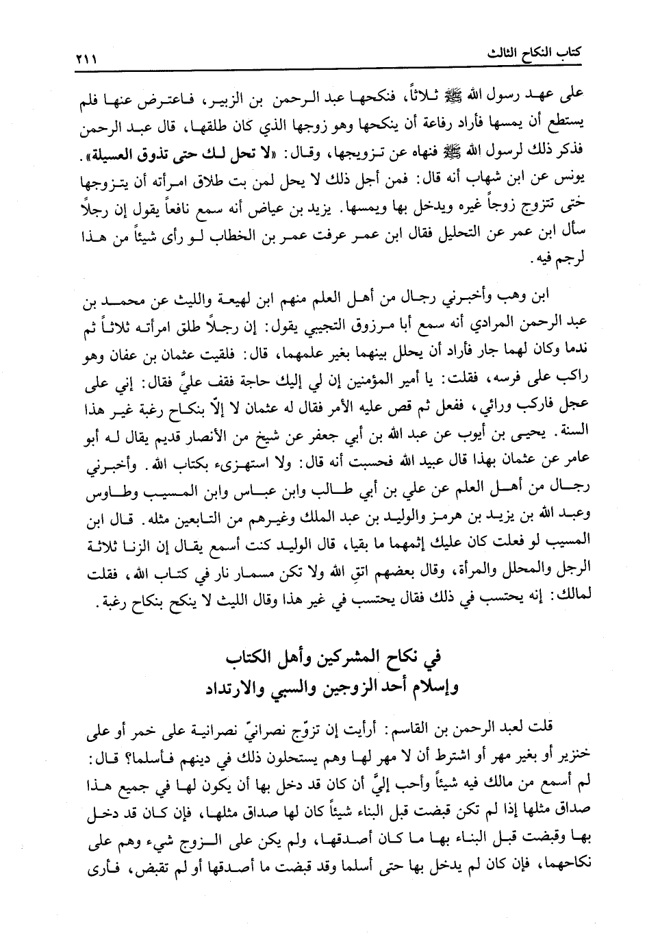 ابْنُ وَهْبٍ وَأَخْبَرَنِي رِجَالٌ مِنْ أَهْلِ الْعِلْمِ مِنْهُمْ ابْنُ لَهِيعَةَ وَاللَّيْثُ عَنْ مُحَمَّدِ بْنِ عَبْدِ الرَّحْمَنِ الْمُرَادِيِّ أَنَّهُ سَمِعَ أَبَا مَرْزُوقٍ التُّجِيبِيَّ يَقُولُ: إنَّ رَجُلًا طَلَّقَ امْرَأَتَهُ ثَلَاثًا ثُمَّ نَدِمَا وَكَانَ لَهُمَا جَارٌ فَأَرَادَ أَنْ يُحَلِّلَ بَيْنَهُمَا بِغَيْرِ عِلْمِهِمَا، قَالَ: فَلَقِيتُ عُثْمَانَ بْنَ عَفَّانَ وَهُوَ رَاكِبٌ عَلَى فَرَسِهِ، فَقُلْتُ: يَا أَمِيرَ الْمُؤْمِنِينَ إنَّ لِي إلَيْك حَاجَةً فَقِفْ عَلَيَّ فَقَالَ: إنِّي عَلَى عَجَلٍ فَارْكَبْ وَرَائِي، فَفَعَلَ ثُمَّ قَصَّ عَلَيْهِ الْأَمْرَ فَقَالَ لَهُ عُثْمَانُ لَا إلَّا بِنِكَاحِ رَغْبَةٍ غَيْرُ هَذَا السُّنَّةُ.