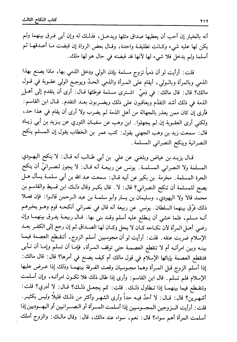 قُلْتُ: أَرَأَيْتَ لَوْ أَنَّ مَجُوسِيَّيْنِ أَسْلَمَ الزَّوْجُ، أَتَنْقَطِعُ الْعِصْمَةُ فِيمَا بَيْنَهُ وَبَيْنَ امْرَأَتِهِ أَمْ لَا تَنْقَطِعُ الْعِصْمَةُ حَتَّى تُوقَفَ الْمَرْأَةُ، فَإِمَّا أَنْ تُسْلِمَ وَإِمَّا أَنْ تَأْبَى فَتَنْقَطِعَ الْعِصْمَةُ بِإِبَائِهَا الْإِسْلَامَ فِي قَوْلِ مَالِكٍ أَمْ كَيْفَ يُصْنَعُ فِي أَمْرِهَا؟