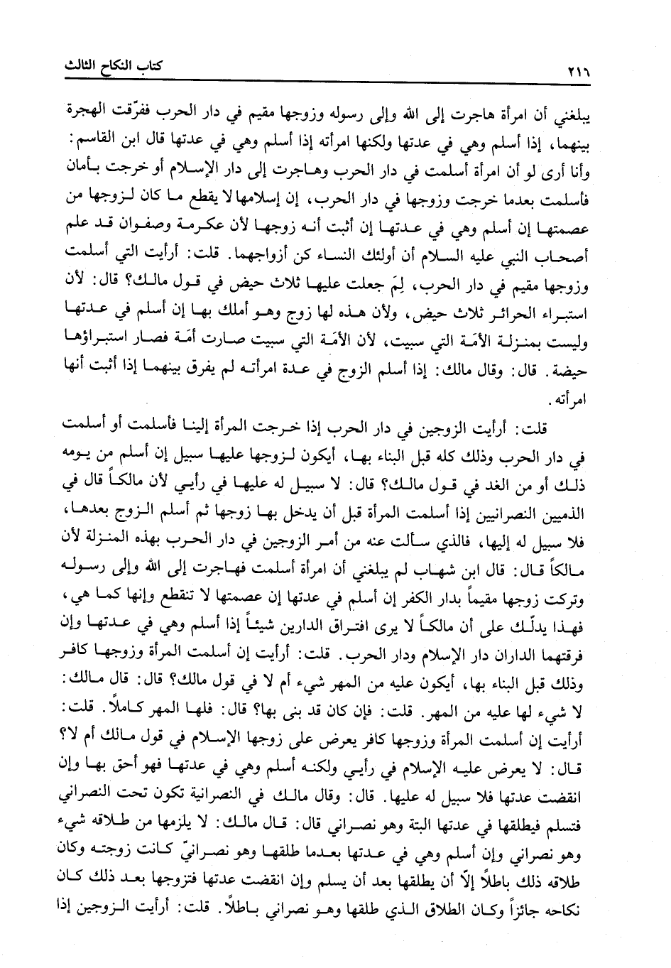 قُلْتُ: أَرَأَيْتَ الَّتِي أَسْلَمَتْ وَزَوْجُهَا مُقِيمٌ فِي دَارِ الْحَرْبِ، لِمَ جَعَلْتُ عَلَيْهَا ثَلَاثَ حِيَضٍ فِي قَوْلِ مَالِكٍ؟