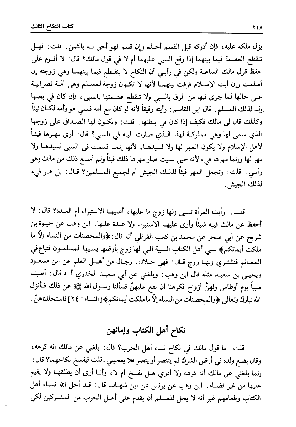 َّ قُلْتُ: مَا قَوْلُ مَالِكٍ فِي نِكَاحِ نِسَاءِ أَهْلِ الْحَرْبِ؟