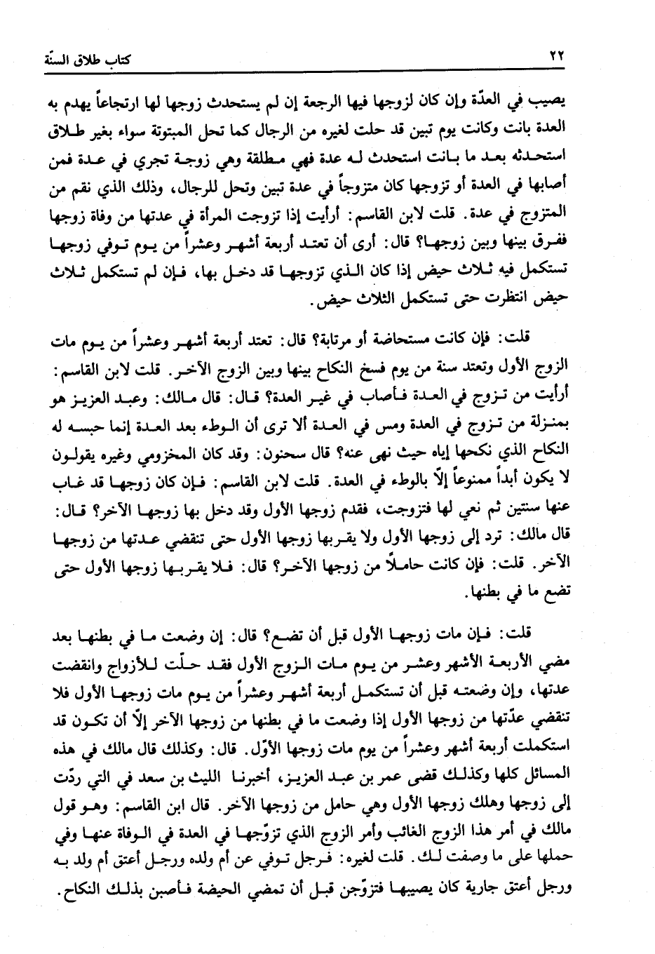 قَالَ: إنْ وَضَعَتْ مَا فِي بَطْنِهَا بَعْدَ مُضِيِّ الْأَرْبَعَةِ الْأَشْهُرِ وَعَشْرٍ مِنْ يَوْمِ مَاتَ الزَّوْجُ الْأَوَّلُ فَقَدْ حَلَّتْ لِلْأَزْوَاجِ وَانْقَضَتْ عِدَّتُهَا، وَإِنْ وَضَعَتْهُ قَبْلَ أَنْ تَسْتَكْمِلَ أَرْبَعَةَ أَشْهُرٍ وَعَشْرًا مِنْ يَوْمِ مَاتَ زَوْجُهَا الْأَوَّلُ فَلَا تَنْقَضِي عِدَّتُهَا مِنْ زَوْجِهَا الْأَوَّلِ إذَا وَضَعَتْ مَا فِي بَطْنِهَا مِنْ زَوْجِهَا الْآخَرِ إلَّا أَنْ تَكُونَ قَدْ اسْتَكْمَلَتْ أَرْبَعَةَ أَشْهُرٍ وَعَشْرًا مِنْ يَوْمِ مَاتَ زَوْجُهَا الْأَوَّلُ قَالَ: وَكَذَلِكَ قَالَ مَالِكٌ فِي هَذِهِ الْمَسَائِلِ كُلِّهَا، وَكَذَلِكَ قَضَى عُمَرُ بْنُ عَبْدِ الْعَزِيزِ، أَخْبَرَنَا اللَّيْثُ بْنُ سَعْدٍ فِي الَّتِي رُدَّتْ إلَى زَوْجِهَا وَهَلَكَ زَوْجُهَا الْأَوَّلُ وَهِيَ حَامِلٌ مِنْ زَوْجِهَا الْآخَرِ قَالَ ابْنُ الْقَاسِمِ: وَهُوَ قَوْلُ مَالِكٍ فِي أَمْرِ هَذَا الزَّوْجِ الْغَائِبِ وَأَمْرِ الزَّوْجِ الَّذِي تَزَوَّجَهَا فِي الْعِدَّةِ وَفِي الْوَفَاةِ عَنْهَا وَفِي حَمْلِهَا عَلَى مَا وَصَفْتُ لَك، قُلْتُ لِغَيْرِهِ: فَرَجُلٌ تُوُفِّيَ عَنْ أُمِّ وَلَدِهِ وَرَجُلٌ أَعْتَقَ أُمَّ وَلَدِهِ وَرَجُلٌ أَعْتَقَ جَارِيَةً كَانَ يُصِيبُهَا فَتَزَوَّجْنَ قَبْلَ أَنْ تَمْضِي الْحَيْضَةُ فَأَصَبْنَ بِذَلِكَ النِّكَاحَ.