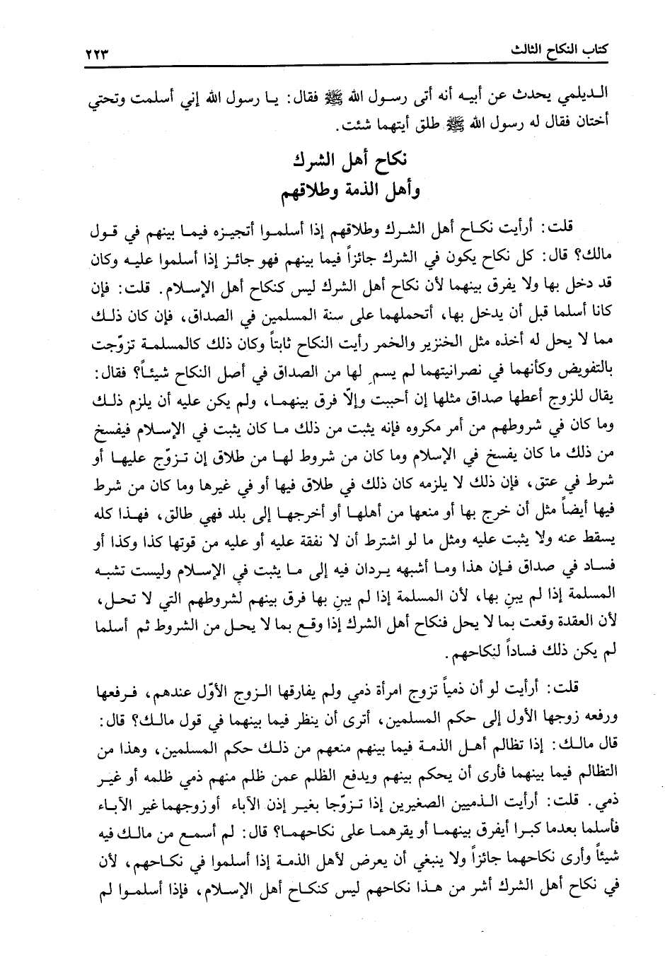ْ قُلْتُ: أَرَأَيْتَ نِكَاحَ أَهْلِ الشِّرْكِ وَطَلَاقَهُمْ إذَا أَسْلَمُوا أَتُجِيزُهُ فِيمَا بَيْنَهُمْ فِي قَوْلِ مَالِكٍ؟
