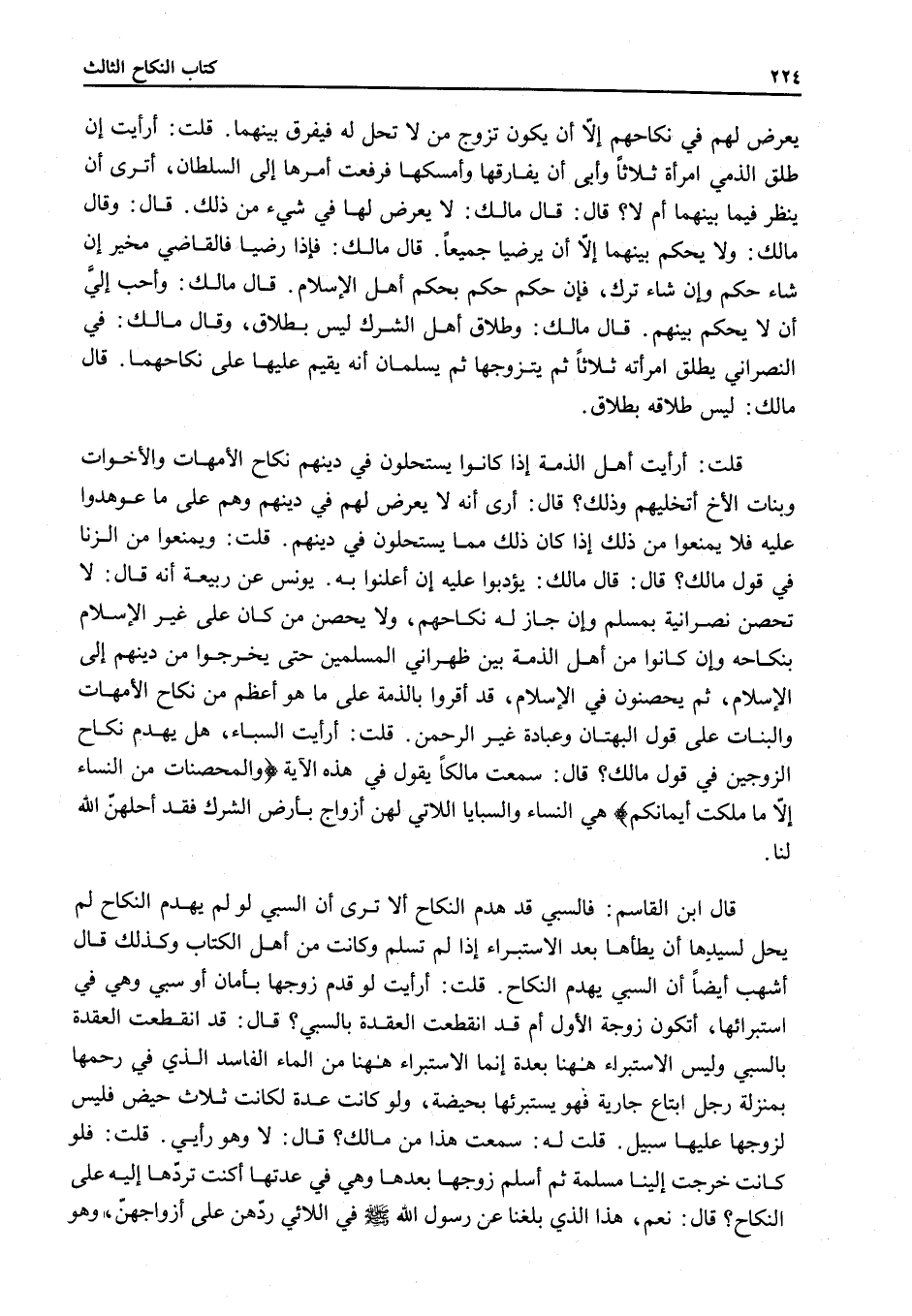 قُلْتُ: أَرَأَيْتَ أَهْلَ الذِّمَّةِ إذَا كَانُوا يَسْتَحِلُّونَ فِي دِينِهِمْ نِكَاحَ الْأُمَّهَاتِ وَالْأَخَوَاتِ وَبَنَاتِ الْأَخِ أَتُخَلِّيهِمْ وَذَلِكَ؟ قَالَ: أَرَى أَنَّهُ لَا يُعْرَضُ لَهُمْ فِي دِينِهِمْ وَهُمْ عَلَى مَا عُوهِدُوا عَلَيْهِ فَلَا يُمْنَعُوا مِنْ ذَلِكَ إذَا كَانَ ذَلِكَ مِمَّا يَسْتَحِلُّونَ فِي دِينِهِمْ.