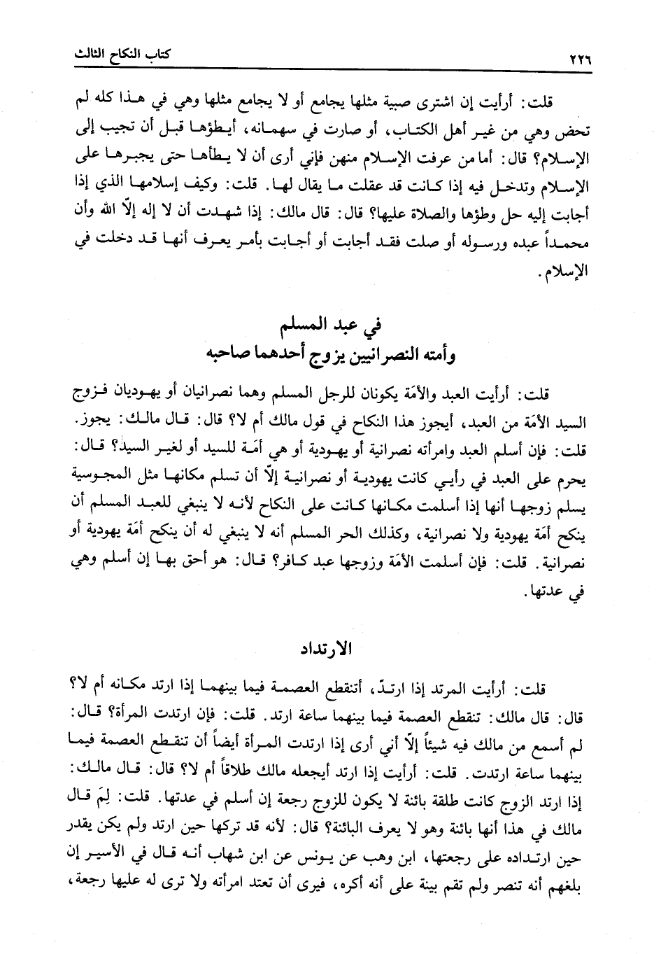الِارْتِدَادُ قُلْتُ: أَرَأَيْتَ الْمُرْتَدَّ إذَا ارْتَدَّ، أَتَنْقَطِعُ الْعِصْمَةُ فِيمَا بَيْنَهُمَا إذَا ارْتَدَّ مَكَانَهُ أَمْ لَا؟ قَالَ: قَالَ مَالِكٌ: تَنْقَطِعُ الْعِصْمَةُ فِيمَا بَيْنَهُمَا سَاعَةَ ارْتَدَّ.