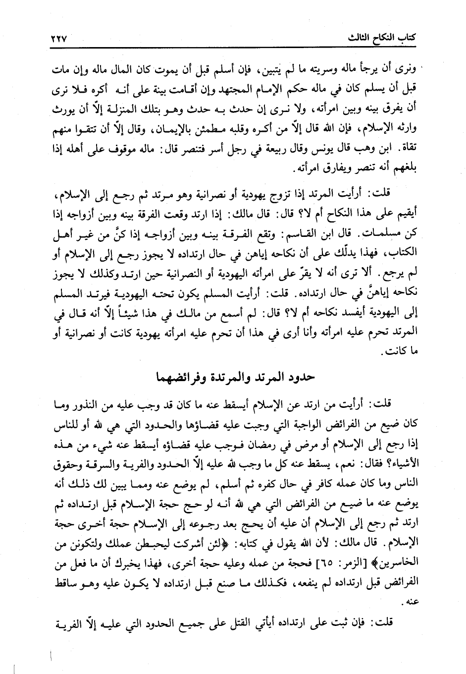 قُلْتُ: أَرَأَيْت الْمُرْتَدَّ إذَا تَزَوَّجَ يَهُودِيَّةً أَوْ نَصْرَانِيَّةً وَهُوَ مُرْتَدٌّ ثُمَّ رَجَعَ إلَى الْإِسْلَامِ، أَيُقِيمُ عَلَى هَذَا النِّكَاحِ أَمْ لَا؟ قَالَ: قَالَ مَالِكٌ: إذَا ارْتَدَّ وَقَعَتْ الْفُرْقَةُ بَيْنَهُ وَبَيْنَ أَزْوَاجِهِ إذَا كُنَّ مُسْلِمَاتٍ.