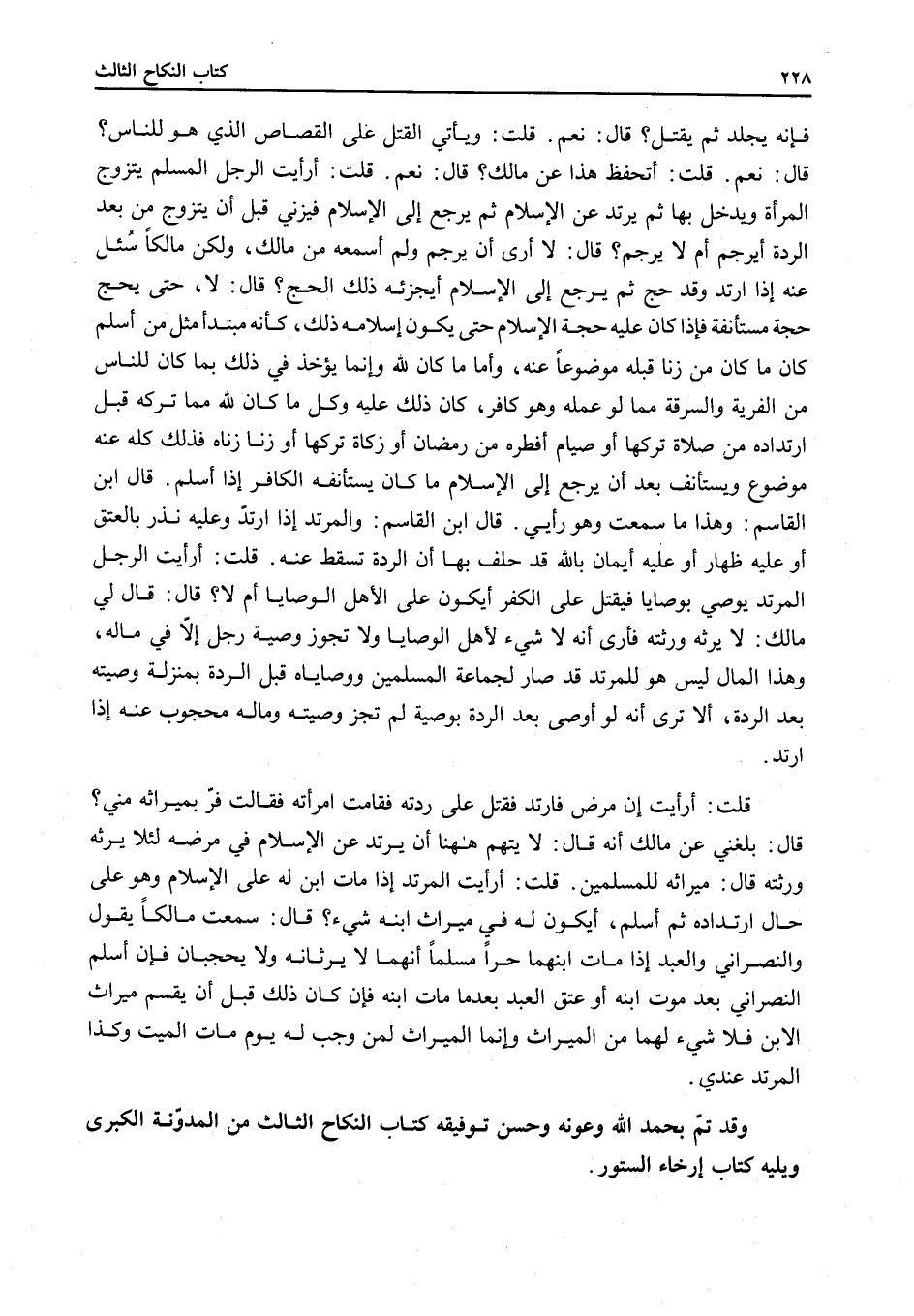 قُلْتُ: أَرَأَيْتَ إنْ مَرِضَ فَارْتَدَّ فَقُتِلَ عَلَى رِدَّتِهِ فَقَامَتْ امْرَأَتُهُ فَقَالَتْ فَرَّ بِمِيرَاثِهِ مِنِّي؟ قَالَ: بَلَغَنِي عَنْ مَالِكٍ أَنَّهُ قَالَ: لَا يُتَّهَمُ هَهُنَا أَنْ يَرْتَدَّ عَنْ الْإِسْلَامِ فِي مَرَضِهِ لِئَلَّا يَرِثَهُ وَرَثَتُهُ قَالَ: مِيرَاثُهُ لِلْمُسْلِمِينَ.