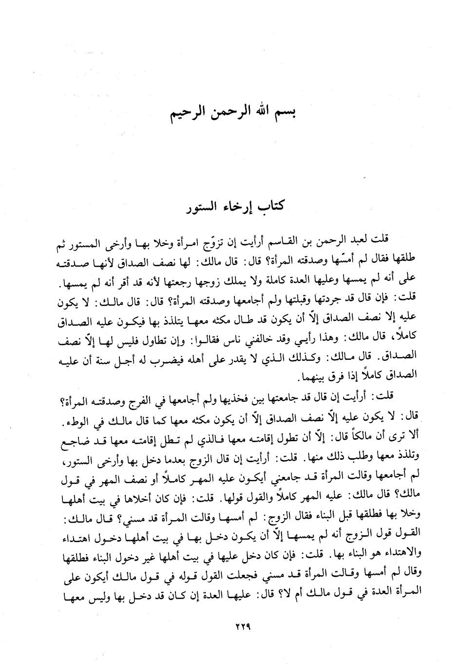 ِ قُلْتُ لِعَبْدِ الرَّحْمَنِ بْنِ الْقَاسِمِ أَرَأَيْتَ إنْ تَزَوَّجَ امْرَأَةً وَخَلَا بِهَا وَأَرْخَى الْمَسْتُورَ ثُمَّ طَلَّقَهَا فَقَالَ لَمْ أَمَسَّهَا وَصَدَّقَتْهُ الْمَرْأَةُ؟ قَالَ: قَالَ مَالِكٌ: لَهَا نِصْفُ الصَّدَاقِ؛ لِأَنَّهَا صَدَّقَتْهُ عَلَى أَنَّهُ لَمْ يَمَسَّهَا وَعَلَيْهَا الْعِدَّةُ كَامِلَةً وَلَا يَمْلِكُ زَوْجُهَا رَجْعَتَهَا؛ لِأَنَّهُ قَدْ أَقَرَّ أَنَّهُ لَمْ يَمَسَّهَا.