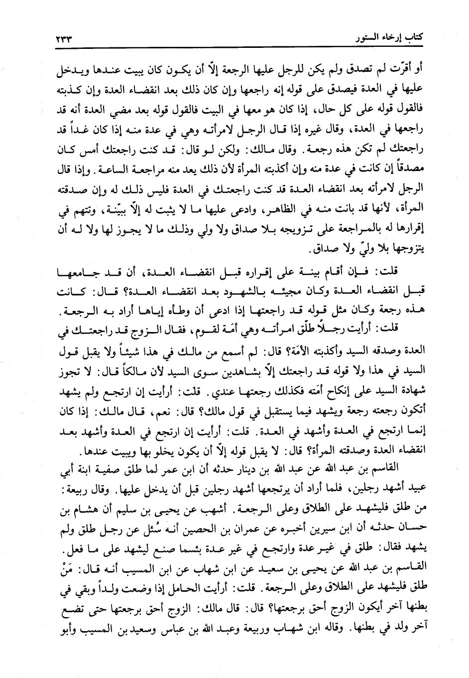 قَالَ: لَا يُقْبَلُ قَوْلُهُ إلَّا أَنْ يَكُونَ يَخْلُو بِهَا وَيَبِيتُ عِنْدَهَا. الْقَاسِمُ بْنُ عَبْدِ اللَّهِ عَنْ عَبْدِ اللَّهِ بْنِ دِينَارٍ حَدَّثَهُ أَنَّ ابْنَ عُمَرَ لَمَّا طَلَّقَ صَفِيَّةَ ابْنَةَ أَبِي عُبَيْدٍ أَشْهَدَ رَجُلَيْنِ، فَلَمَّا أَرَادَ أَنْ يَرْتَجِعَهَا أَشْهَدَ رَجُلَيْنِ قَبْلَ أَنْ يَدْخُلَ عَلَيْهَا. وَقَالَ رَبِيعَةُ: مَنْ طَلَّقَ فَلْيُشْهِدْ عَلَى الطَّلَاقِ وَعَلَى الرَّجْعَةِ. أَشْهَبُ عَنْ يَحْيَى بْنِ سُلَيْمٍ أَنَّ هِشَامَ بْنَ حَسَّانَ حَدَّثَهُ أَنَّ ابْنَ سِيرِينَ أَخْبَرَهُ عَنْ عِمْرَانَ بْنِ الْحُصَيْنِ أَنَّهُ سُئِلَ عَنْ رَجُلٍ طَلَّقَ وَلَمْ يُشْهِدْ فَقَالَ: طَلَّقَ فِي غَيْرِ عِدَّةٍ وَارْتَجَعَ فِي غَيْرِ عِدَّةٍ بِئْسَمَا صَنَعَ لِيُشْهِدْ عَلَى مَا فَعَلَ. الْقَاسِمُ بْنُ عَبْدِ اللَّهِ عَنْ يَحْيَى بْنِ سَعِيدٍ عَنْ ابْنِ شِهَابٍ عَنْ ابْنِ الْمُسَيِّبِ أَنَّهُ قَالَ: مَنْ طَلَّقَ فَلْيُشْهِدْ عَلَى الطَّلَاقِ وَعَلَى الرَّجْعَةِ.