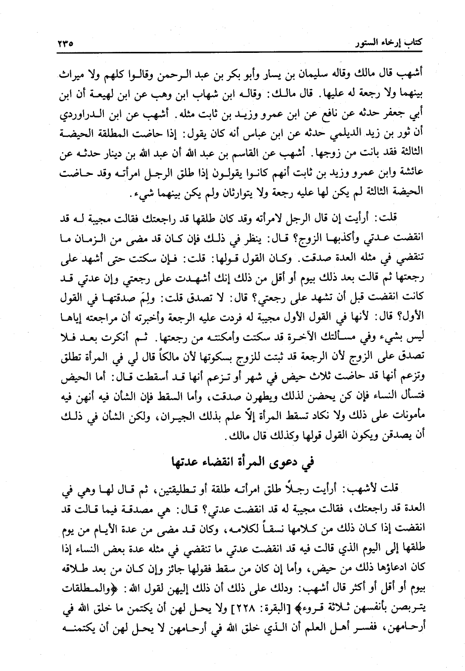 فِي دَعْوَى الْمَرْأَةِ انْقِضَاءَ عِدَّتِهَا قُلْتُ لِأَشْهَبَ: أَرَأَيْتَ رَجُلًا طَلَّقَ امْرَأَتَهُ طَلْقَةً أَوْ تَطْلِيقَتَيْنِ، ثُمَّ قَالَ لَهَا وَهِيَ فِي الْعِدَّةِ قَدْ رَاجَعْتُكِ، فَقَالَتْ مُجِيبَةً لَهُ قَدْ انْقَضَتْ عِدَّتِي؟ قَالَ: هِيَ مُصَدَّقَةٌ فِيمَا قَالَتْ قَدْ انْقَضَتْ إذَا كَانَ ذَلِكَ مِنْ كَلَامِهَا نَسَقًا لِكَلَامِهِ، وَكَانَ قَدْ مَضَى مِنْ عِدَّةِ الْأَيَّامِ مِنْ يَوْمِ طَلَّقَهَا إلَى الْيَوْمِ الَّذِي قَالَتْ فِيهِ قَدْ انْقَضَتْ عِدَّتِي مَا تَنْقَضِي فِي مِثْلِهِ عِدَّةُ بَعْضِ النِّسَاءِ إذَا كَانَ ادِّعَاؤُهَا ذَلِكَ مِنْ حَيْضٍ، وَأَمَّا إنْ كَانَ مِنْ سَقْطٍ فَقَوْلُهَا جَائِزٌ، وَإِنْ كَانَ مِنْ بَعْدَ طَلَاقِهِ بِيَوْمٍ أَوْ أَقَلَّ أَوْ أَكْثَرَ قَالَ أَشْهَبُ: وَدَلَّكَ عَلَى ذَلِكَ أَنَّ ذَلِكَ إلَيْهِنَّ لِقَوْلِ اللَّهِ: {وَالْمُطَلَّقَاتُ يَتَرَبَّصْنَ بِأَنْفُسِهِنَّ ثَلَاثَةَ قُرُوءٍ وَلَا يَحِلُّ لَهُنَّ أَنْ يَكْتُمْنَ مَا خَلَقَ اللَّهُ فِي أَرْحَامِهِنَّ} [البقرة: 228] ، فَفَسَّرَ أَهْلُ الْعِلْمِ أَنَّ الَّذِي خَلَقَ اللَّهُ فِي أَرْحَامِهِنَّ لَا يَحِلُّ لَهُنَّ أَنْ يَكْتُمْنَهُ