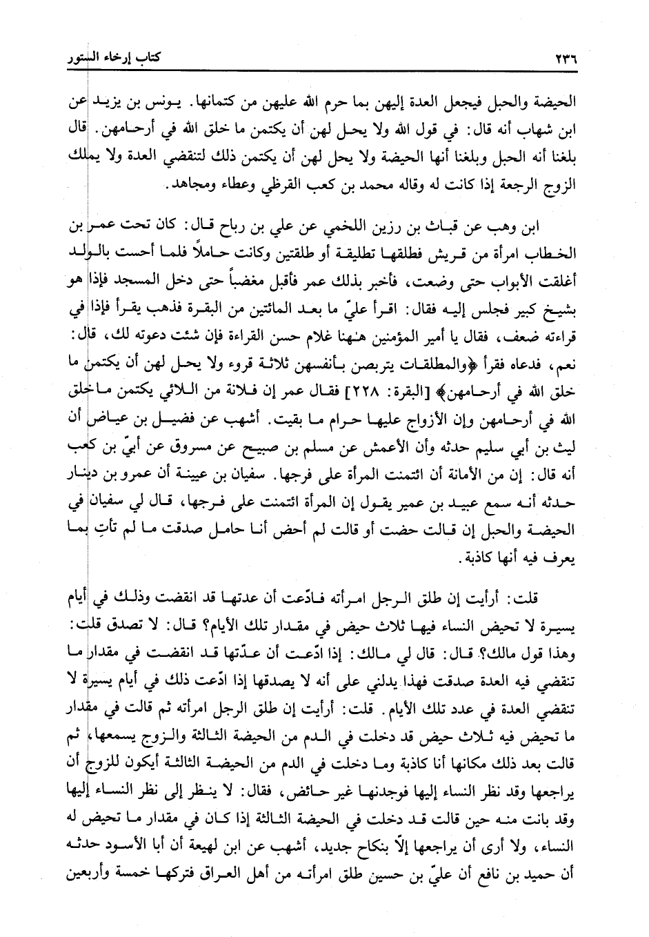 ابْنُ وَهْبٍ عَنْ قَبَاثِ بْنِ رَزِينٍ اللَّخْمِيِّ عَنْ عَلِيِّ بْنِ رَبَاحٍ قَالَ: كَانَ تَحْتَ عُمَرَ بْنِ الْخَطَّابِ امْرَأَةٌ مِنْ قُرَيْشٍ فَطَلَّقَهَا تَطْلِيقَةً أَوْ طَلْقَتَيْنِ وَكَانَتْ حَامِلًا فَلَمَّا أَحَسَّتْ بِالْوَلَدِ أَغْلَقَتْ الْأَبْوَابَ حَتَّى وَضَعَتْ، فَأُخْبِرَ بِذَلِكَ عُمَرُ فَأَقْبَلَ مُغْضَبًا حَتَّى دَخَلَ الْمَسْجِدَ فَإِذَا هُوَ بِشَيْخٍ كَبِيرٍ فَجَلَسَ إلَيْهِ فَقَالَ: اقْرَأْ عَلَيَّ مَا بَعْدَ الْمِائَتَيْنِ مِنْ الْبَقَرَةِ فَذَهَبَ يَقْرَأُ فَإِذَا فِي قِرَاءَتِهِ ضَعْفٌ، فَقَالَ يَا أَمِيرَ الْمُؤْمِنِينَ هَهُنَا غُلَامٌ حَسَنُ الْقِرَاءَةِ فَإِنْ شِئْتَ دَعْوَتُهُ لَكَ، قَالَ: نَعَمْ، فَدَعَاهُ فَقَرَأَ {وَالْمُطَلَّقَاتُ يَتَرَبَّصْنَ بِأَنْفُسِهِنَّ ثَلَاثَةَ قُرُوءٍ وَلَا يَحِلُّ لَهُنَّ أَنْ يَكْتُمْنَ مَا خَلَقَ اللَّهُ فِي أَرْحَامِهِنَّ} [البقرة: 228] فَقَالَ عُمَرُ إنَّ فُلَانَةَ مِنْ اللَّائِي يَكْتُمْنَ مَا خَلَقَ اللَّهُ فِي أَرْحَامِهِنَّ وَإِنَّ الْأَزْوَاجَ عَلَيْهَا حَرَامٌ مَا بَقِيَتْ. أَشْهَبُ عَنْ فُضَيْلِ بْنِ عِيَاضٍ أَنَّ لَيْثَ بْنَ أَبِي سُلَيْمٍ حَدَّثَهُ وَأَنَّ الْأَعْمَشَ عَنْ مُسْلِمِ بْنِ صُبَيْحٍ عَنْ مَسْرُوقٍ عَنْ أُبَيَّ بْنِ كَعْبٍ أَنَّهُ قَالَ: إنَّ مِنْ الْأَمَانَةِ أَنْ ائْتُمِنْتِ الْمَرْأَةُ عَلَى فَرْجِهَا.
