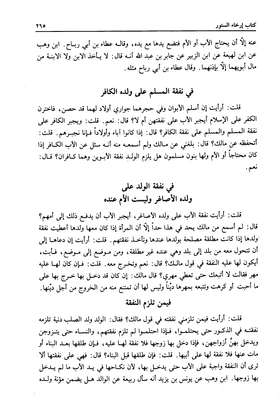 قُلْتُ: أَرَأَيْتَ فِيمَنْ تَلْزَمُنِي نَفَقَتُهُ فِي قَوْلِ مَالِكٍ؟ فَقَالَ: الْوَلَدُ وَلَدُ الصُّلْبِ دُنْيَةً تَلْزَمُهُ نَفَقَتُهُ فِي الذُّكُورِ حَتَّى يَحْتَلِمُوا، فَإِذَا احْتَلَمُوا لَمْ تَلْزَمْ نَفَقَتُهُمْ، وَالنِّسَاءِ حَتَّى يَتَزَوَّجْنَ وَيَدْخُلَ بِهِنَّ أَزْوَاجُهُنَّ، فَإِذَا دَخَلَ بِهَا زَوْجُهَا فَلَا نَفَقَةَ لَهَا عَلَيْهِ، فَإِنْ طَلَّقَهَا بَعْدَ الْبِنَاءِ أَوْ مَاتَ عَنْهَا فَلَا نَفَقَةَ لَهَا عَلَى أَبِيهَا.