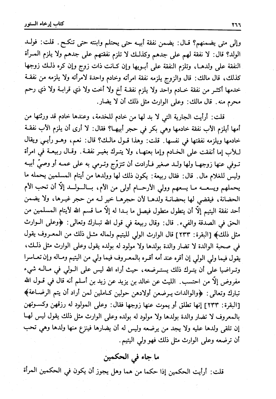 وَإِلَى مَتَى يَضْمَنُهُمْ؟ قَالَ: يَضْمَنُ نَفَقَةَ ابْنِهِ حَتَّى يَحْتَلِمَ وَابْنَتِهِ حَتَّى تُنْكَحَ. قُلْتُ: فَوَلَدُ الْوَلَدِ؟ قَالَ: لَا نَفَقَةَ لَهُمْ عَلَى جَدِّهِمْ وَكَذَلِكَ لَا تَلْزَمُ نَفَقَتُهُمْ عَلَى جَدِّهِمْ وَلَا يَلْزَمُ الْمَرْأَةَ النَّفَقَةُ عَلَى وَلَدِهَا، وَتَلْزَمُ النَّفَقَةُ عَلَى أَبَوَيْهَا وَإِنْ كَانَتْ ذَاتَ زَوْجٍ، وَإِنْ كَرِهَ ذَلِكَ زَوْجُهَا كَذَلِكَ، قَالَ مَالِكٌ: قَالَ وَالزَّوْجُ يَلْزَمُهُ نَفَقَةُ امْرَأَتِهِ وَخَادِمٍ وَاحِدَةٍ لِامْرَأَتِهِ وَلَا يَلْزَمُهُ مِنْ نَفَقَةِ خَدَمِهَا أَكْثَرُ مِنْ نَفَقَةِ خَادِمٍ وَاحِدٍ وَلَا يَلْزَمُ نَفَقَةُ أَخٍ وَلَا أُخْتٍ وَلَا ذِي قَرَابَةٍ وَلَا ذِي رَحِمٍ مَحْرَمٍ مِنْهُ، قَالَ مَالِكٌ: وَعَلَى الْوَارِثِ مِثْلُ ذَلِكَ أَنْ لَا يُضَارَّ.