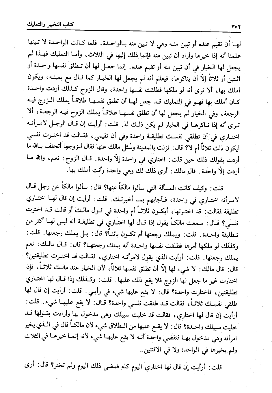 قَالَ: سَأَلُوا مَالِكًا عَنْ رَجُلٍ قَالَ لِامْرَأَتِهِ اخْتَارِي فِي وَاحِدَةٍ، فَأَجَابَهُمْ بِمَا أَخْبَرْتُكَ.