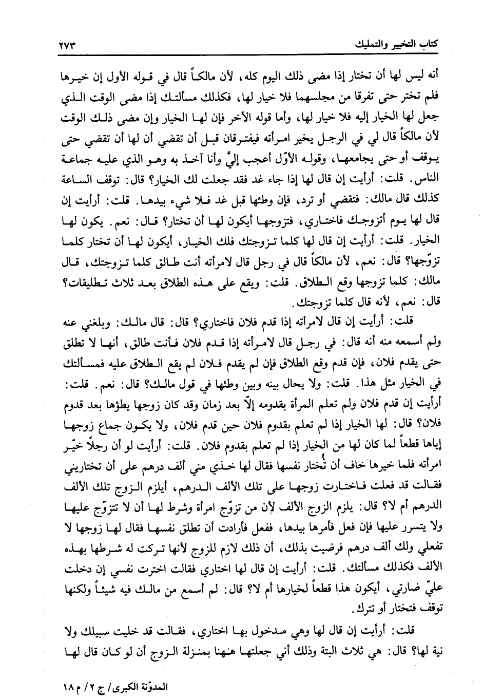 قُلْتُ: أَرَأَيْتَ إنْ قَالَ لَهَا: يَوْمَ أَتَزَوَّجُك فَاخْتَارِي، فَتَزَوَّجَهَا أَيَكُونُ لَهَا أَنْ تَخْتَارَ؟ قَالَ: نَعَمْ يَكُونُ لَهَا الْخِيَارُ.