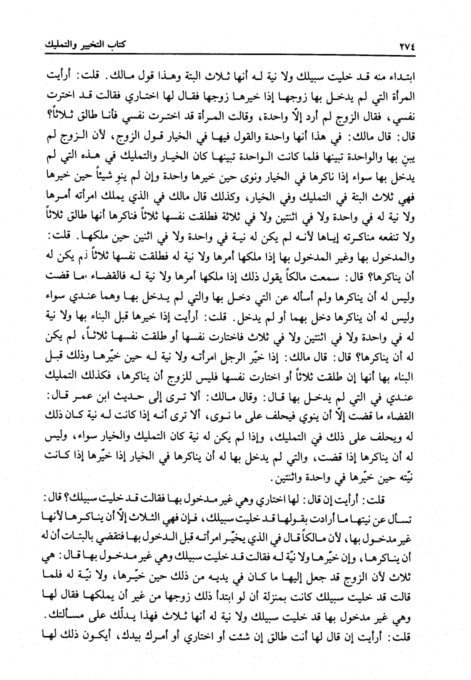قَالَ: قَالَ مَالِكٌ: إذَا خَيَّرَ الرَّجُلُ امْرَأَتَهُ وَلَا نِيَّةَ لَهُ حِينَ خَيَّرَهَا وَذَلِكَ قَبْلَ الْبِنَاءِ بِهَا: إنَّهَا إنْ طَلَّقَتْ ثَلَاثًا أَوْ اخْتَارَتْ نَفْسَهَا فَلَيْسَ لِلزَّوْجِ أَنْ يُنَاكِرَهَا، فَكَذَلِكَ التَّمْلِيكُ عِنْدِي فِي الَّتِي لَمْ يُدْخَلْ بِهَا قَالَ: وَقَالَ مَالِكٌ: أَلَا تَرَى إلَى حَدِيثِ ابْنِ عُمَرَ، قَالَ: الْقَضَاءُ مَا قَضَتْ إلَّا أَنْ يَنْوِيَ فَيَحْلِفَ عَلَى مَا نَوَى، أَلَا تَرَى أَنَّهُ إذَا كَانَتْ لَهُ نِيَّةٌ كَانَ ذَلِكَ لَهُ وَيَحْلِفُ عَلَى ذَلِكَ فِي التَّمْلِيكِ، وَإِذَا لَمْ يَكُنْ لَهُ نِيَّةٌ كَانَ التَّمْلِيكُ وَالْخِيَارُ سَوَاءً، وَلَيْسَ لَهُ أَنْ يُنَاكِرَهَا إذَا قَضَتْ، وَاَلَّتِي لَمْ يَدْخُلْ بِهَا لَهُ أَنْ يُنَاكِرَهَا فِي الْخِيَارِ إذَا خَيَّرَهَا إذَا كَانَتْ نِيَّتُهُ حِينَ خَيَّرَهَا فِي وَاحِدَةٍ وَاثْنَتَيْنِ.