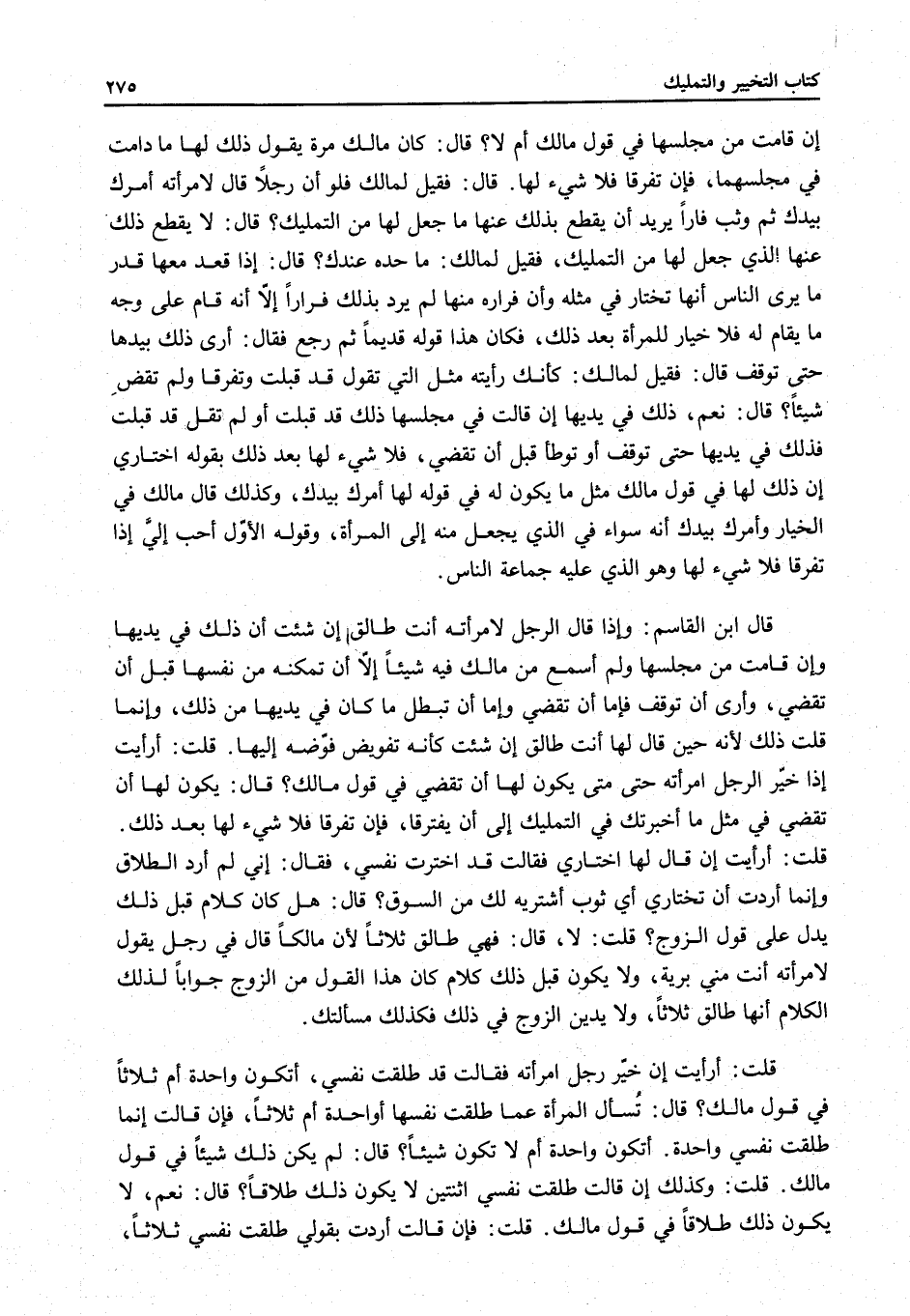 قُلْتُ: أَرَأَيْتَ إنْ خَيَّرَ رَجُلٌ امْرَأَتَهُ فَقَالَتْ قَدْ طَلَّقْتُ نَفْسِي، أَتَكُونُ وَاحِدَةً أَمْ ثَلَاثًا فِي قَوْلِ مَالِكٍ؟ قَالَ: تُسْأَلُ الْمَرْأَةُ عَمَّا طَلَّقَتْ نَفْسَهَا أَوَاحِدَةً أَمْ ثَلَاثًا، فَإِنْ قَالَتْ إنَّمَا طَلَّقْتُ نَفْسِي وَاحِدَةً أَتَكُونُ وَاحِدَةً أَمْ لَا تَكُونُ شَيْئًا؟