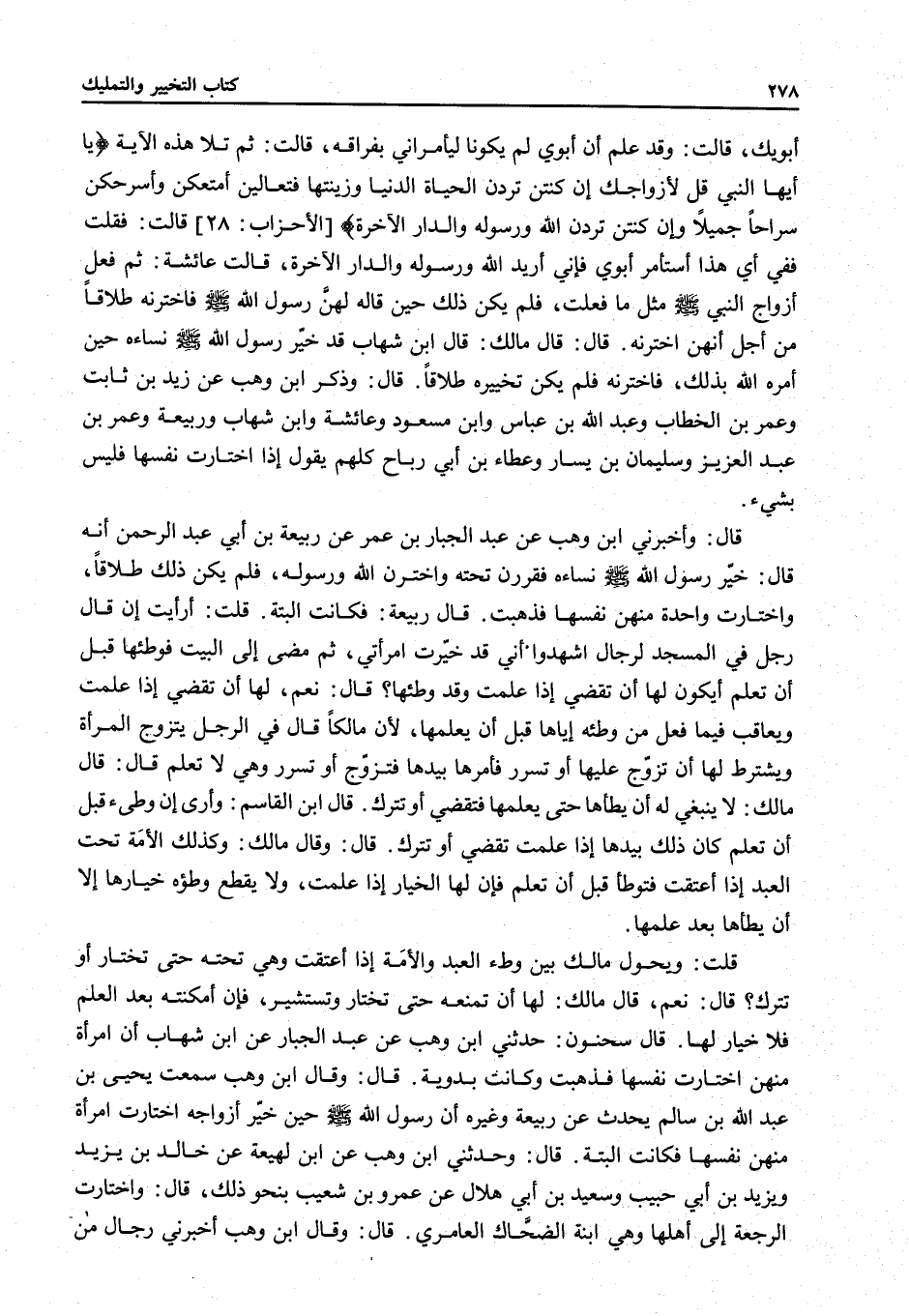 أَبَوَيْكِ، قَالَتْ: وَقَدْ عَلِمَ أَنَّ أَبَوَيَّ لَمْ يَكُونَا لِيَأْمُرَانِي بِفِرَاقِهِ، قَالَتْ: ثُمَّ تَلَا هَذِهِ الْآيَةَ {يَا أَيُّهَا النَّبِيُّ قُلْ لأَزْوَاجِكَ إِنْ كُنْتُنَّ تُرِدْنَ الْحَيَاةَ الدُّنْيَا وَزِينَتَهَا فَتَعَالَيْنَ أُمَتِّعْكُنَّ وَأُسَرِّحْكُنَّ سَرَاحًا جَمِيلا} [الأحزاب: 28] {وَإِنْ كُنْتُنَّ تُرِدْنَ اللَّهَ وَرَسُولَهُ وَالدَّارَ الآخِرَةَ} [الأحزاب: 29] قَالَتْ: فَقُلْتُ فَفِي أَيِّ هَذَا أَسْتَأْمِرُ أَبَوَيَّ فَإِنِّي أُرِيدُ اللَّهَ وَرَسُولَهُ وَالدَّارَ الْآخِرَةَ، قَالَتْ عَائِشَةُ: ثُمَّ فَعَلَ أَزْوَاجُ النَّبِيِّ - صَلَّى اللَّهُ عَلَيْهِ وَسَلَّمَ - مِثْلَ مَا فَعَلْتُ، فَلَمْ يَكُنْ ذَلِكَ حِينَ قَالَهُ لَهُنَّ رَسُولُ اللَّهِ - صَلَّى اللَّهُ عَلَيْهِ وَسَلَّمَ - فَاخْتَرْنَهُ طَلَاقًا مِنْ أَجْلِ أَنَّهُنَّ اخْتَرْنَهُ» ، قَالَ: قَالَ مَالِكٌ: قَالَ ابْنُ شِهَابٍ قَدْ خَيَّرَ رَسُولُ اللَّهِ - صَلَّى اللَّهُ عَلَيْهِ وَسَلَّمَ - نِسَاءَهُ حِينَ أَمَرَهُ اللَّهُ بِذَلِكَ، فَاخْتَرْنَهُ فَلَمْ يَكُنْ تَخْيِيرُهُ طَلَاقًا، قَالَ: وَذَكَرَ ابْنُ وَهْبٍ عَنْ زَيْدِ بْنِ ثَابِتٍ وَعُمَرَ بْنِ الْخَطَّابِ وَعَبْدِ اللَّهِ بْنِ عَبَّاسٍ وَابْنِ مَسْعُودٍ وَعَائِشَةَ وَابْنِ شِهَابٍ وَرَبِيعَةَ وَعُمَرَ بْنِ عَبْدِ الْعَزِيزِ وَسُلَيْمَانَ بْنِ يَسَارٍ وَعَطَاءِ بْنِ أَبِي رَبَاحٍ كُلُّهُمْ يَقُولُ إذَا اخْتَارَتْ نَفْسَهَا فَلَيْسَ بِشَيْءٍ.