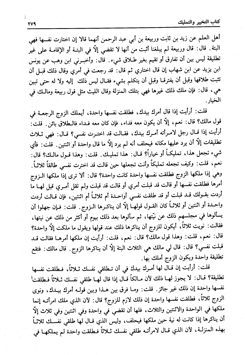 أَهْلِ الْعِلْمِ عَنْ زَيْدِ بْنِ ثَابِتٍ وَرَبِيعَةَ بْنِ أَبِي عَبْدِ الرَّحْمَنِ أَنَّهُمَا قَالَا إنْ اخْتَارَتْ نَفْسَهَا فَهِيَ الْبَتَّةُ، قَالَ: قَالَ رَبِيعَةُ لَمْ يَبْلُغْنَا أَثْبَتُ مِنْ أَنَّهَا لَا تَقْضِي إلَّا فِي الْبَتَّةِ أَوْ الْإِقَامَةِ عَلَى غَيْرِ تَطْلِيقَةٍ لَيْسَ بَيْنَ أَنْ تُفَارِقَ أَوْ تُقِيمَ بِغَيْرِ طَلَاقٍ شَيْءٌ، قَالَ: وَأَخْبَرَنِي ابْنُ وَهْبٍ عَنْ يُونُسَ بْنِ يَزِيدَ عَنْ ابْنِ شِهَابٍ إنْ قَالَ اخْتَارِي ثُمَّ قَالَ: قَدْ رَجَعْتُ فِي أَمْرِي وَقَالَ ذَلِكَ قَبْلَ أَنْ تُثْبِتَ طَلَاقَهَا وَقَبْلَ أَنْ يَفْتَرِقَا وَقَبْلَ أَنْ يَتَكَلَّمَ بِشَيْءٍ فَقَالَ لَيْسَ ذَلِكَ إلَيْهِ وَلَا لَهُ حَتَّى تُبَيِّنَ هِيَ، قَالَ: فَإِنْ مَلَّكَ ذَلِكَ غَيْرَهَا بِتِلْكَ الْمَنْزِلَةِ وَقَالَ اللَّيْثُ مِثْلَ قَوْلِ رَبِيعَةَ وَمَالِكٍ فِي الْخِيَارِ.