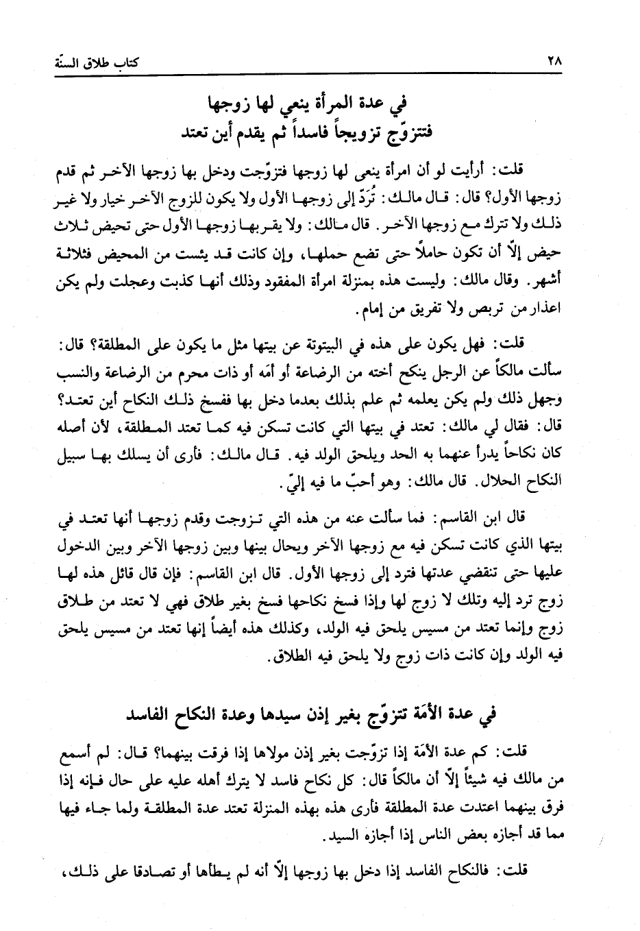 قَالَ ابْنُ الْقَاسِمِ: فَمَا سَأَلْتَ عَنْهُ مَنْ هَذِهِ الَّتِي تَزَوَّجَتْ وَقَدِمَ زَوْجُهَا أَنَّهَا تَعْتَدُّ فِي بَيْتِهَا الَّذِي كَانَتْ تَسْكُنُ فِيهِ مَعَ زَوْجِهَا الْآخَرِ وَيُحَالُ بَيْنَهَا وَبَيْنَ زَوْجِهَا الْآخَرِ وَبَيْنَ الدُّخُولِ عَلَيْهَا حَتَّى تَنْقَضِيَ عِدَّتُهَا فَتُرَدُّ إلَى زَوْجِهَا الْأَوَّلِ قَالَ ابْنُ الْقَاسِمِ: فَإِنْ قَالَ قَائِلٌ هَذِهِ لَهَا زَوْجٌ تُرَدُّ إلَيْهِ وَتِلْكَ لَا زَوْجَ لَهَا وَإِذَا فُسِخَ نِكَاحُهَا فُسِخَ بِغَيْرِ طَلَاقٍ فَهِيَ لَا تَعْتَدُّ مِنْ طَلَاقِ زَوْجٍ وَإِنَّمَا تَعْتَدُّ مِنْ مَسِيسٍ يُلْحَقُ فِيهِ الْوَلَدُ، وَكَذَلِكَ هَذِهِ أَيْضًا أَنَّهَا تَعْتَدُّ مِنْ مَسِيسٍ يُلْحَقُ فِيهِ الْوَلَدُ وَإِنْ كَانَتْ ذَاتَ زَوْجٍ وَلَا يُلْحَقُ فِيهِ الطَّلَاقُ.