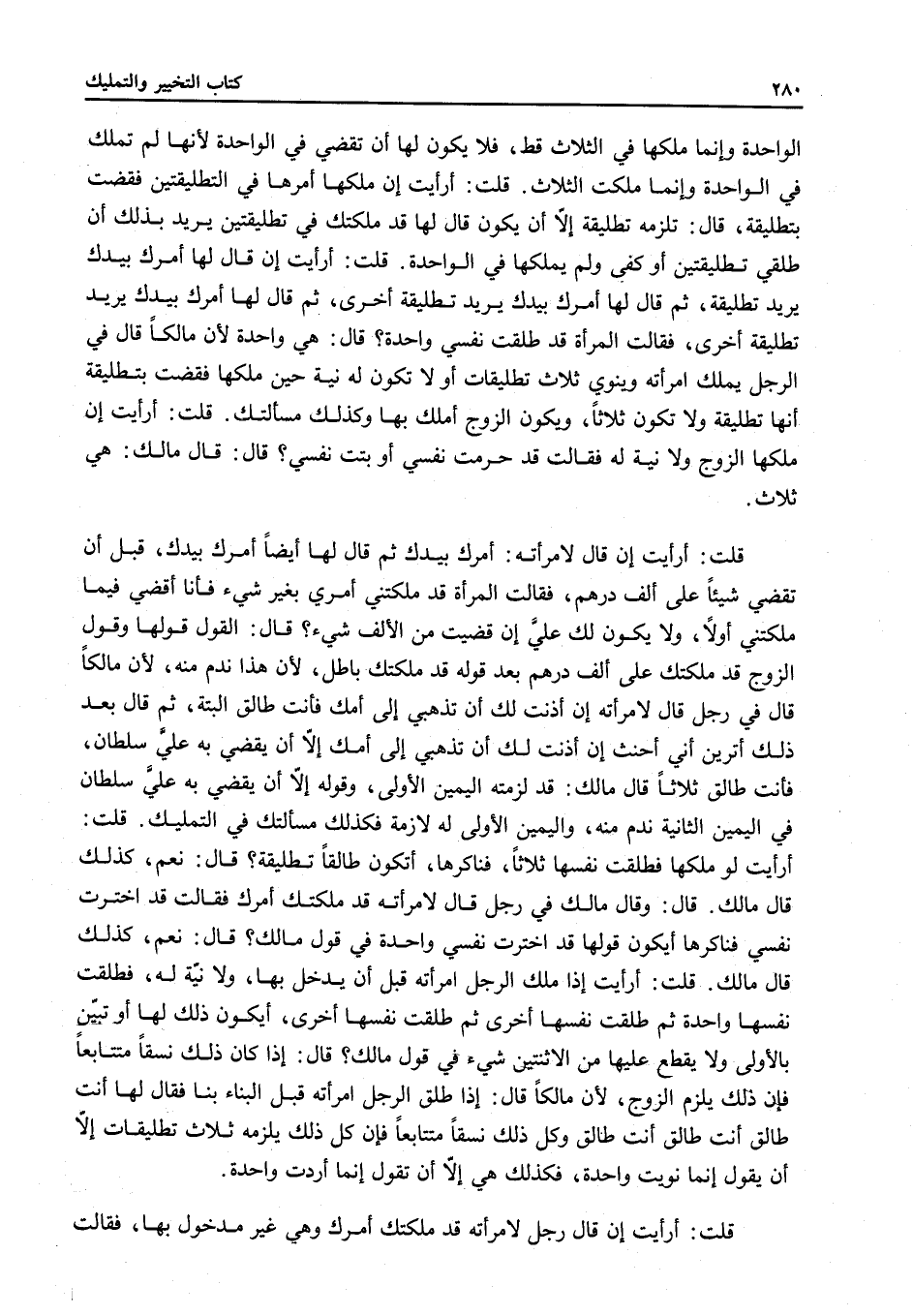 قُلْتُ: أَرَأَيْتَ إنْ مَلَّكَهَا الزَّوْجُ وَلَا نِيَّةَ لَهُ فَقَالَتْ قَدْ حَرَّمْتُ نَفْسِي أَوْ بَتَتُّ نَفْسِي؟ قَالَ: قَالَ مَالِكٌ: هِيَ ثَلَاثٌ.