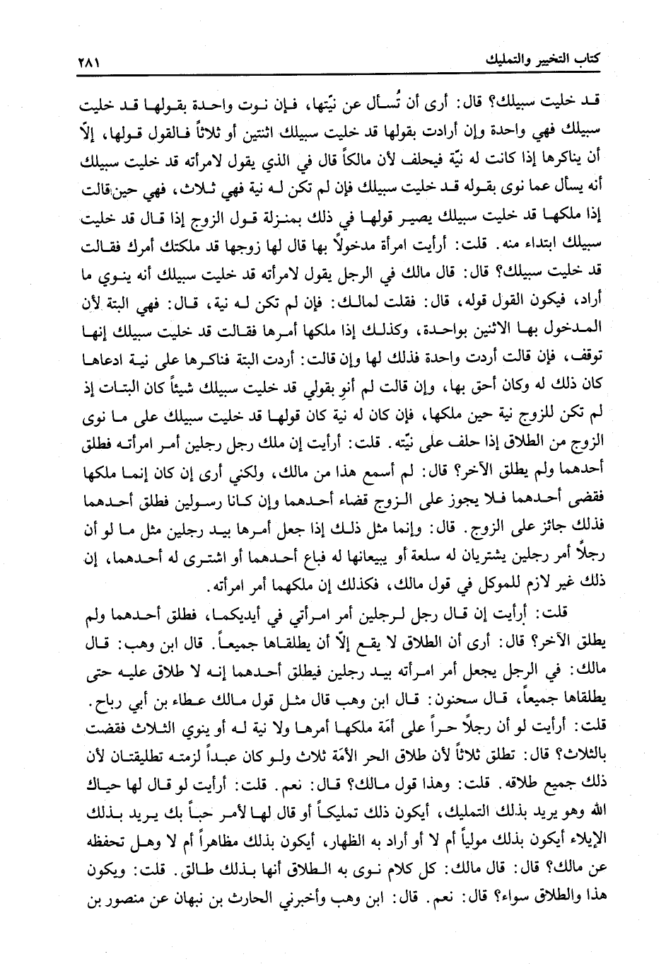قَالَ: قَالَ مَالِكٌ فِي الرَّجُلِ يَقُولُ لِامْرَأَتِهِ قَدْ خَلَّيْتُ سَبِيلَكِ: إنَّهُ يَنْوِي مَا أَرَادَ، فَيَكُونُ الْقَوْلُ قَوْلَهُ، قَالَ فَقُلْتُ لِمَالِكٍ: فَإِنْ لَمْ تَكُنْ لَهُ نِيَّةٌ، قَالَ: فَهِيَ الْبَتَّةُ؛ لِأَنَّ الْمَدْخُولَ بِهَا لَا تَبِينُ بِوَاحِدَةٍ، وَكَذَلِكَ إذَا مَلَّكَهَا أَمْرَهَا فَقَالَتْ قَدْ خَلَّيْتُ سَبِيلَكَ إنَّهَا تُوقَفُ، فَإِنْ قَالَتْ أَرَدْتُ وَاحِدَةً فَذَلِكَ لَهَا وَإِنْ قَالَتْ: أَرَدْتُ أَلْبَتَّةَ فَنَاكَرَهَا عَلَى نِيَّةٍ ادَّعَاهَا كَانَ ذَلِكَ لَهُ وَكَانَ أَحَقَّ بِهَا، وَإِنْ قَالَتْ لَمْ أَنْوِ بِقَوْلِي قَدْ خَلَّيْتُ سَبِيلَكَ شَيْئًا كَانَ الْبَتَاتَ إذْ لَمْ تَكُنْ لِلزَّوْجِ نِيَّةٌ حِينَ مَلَّكَهَا، فَإِنْ كَانَ لَهُ نِيَّةٌ كَانَ قَوْلُهَا قَدْ خَلَّيْتُ سَبِيلَكَ عَلَى مَا نَوَى الزَّوْجُ مِنْ الطَّلَاقِ إذَا حَلَفَ عَلَى نِيَّتِهِ