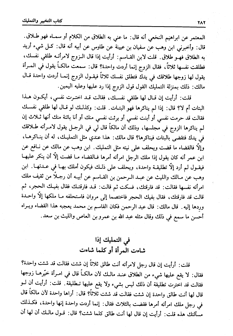 قَالَ مَالِكٌ: هَذَا عِنْدِي مِثْلُ التَّمْلِيكِ، لَهُ أَنْ يُنَاكِرَهَا، وَإِلَّا فَالْقَضَاءُ مَا قَضَتْ وَيَحْلِفُ عَلَى نِيَّتِهِ مِثْلَ التَّمْلِيكِ ابْنُ وَهْبٍ عَنْ مَالِكٍ عَنْ نَافِعٍ عَنْ ابْنِ عُمَرَ أَنَّهُ كَانَ يَقُولُ إذَا مَلَّكَ الرَّجُلُ امْرَأَتَهُ أَمْرَهَا فَالْقَضَاءُ مَا قَضَتْ إلَّا أَنْ يُنْكِرَ عَلَيْهَا فَيَقُولَ لَمْ أُرِدْ إلَّا تَطْلِيقَةً وَاحِدَةً، وَيَحْلِفُ عَلَى ذَلِكَ فَيَكُونُ أَمْلَكَ بِهَا فِي عِدَّتِهَا ابْنُ وَهْبٍ عَنْ مَالِكٍ وَاللَّيْثِ عَنْ عَبْدِ الرَّحْمَنِ بْنِ الْقَاسِمِ عَنْ أَبِيهِ أَنَّ رَجُلًا مِنْ ثَقِيفٍ مَلَّكَ امْرَأَتَهُ نَفْسَهَا فَقَالَتْ: قَدْ فَارَقْتُكَ، فَسَكَتَ ثُمَّ قَالَتْ: قَدْ فَارَقْتُكَ فَقَالَ بِفِيكِ الْحَجَرُ، ثُمَّ قَالَتْ قَدْ فَارَقْتُكَ، فَقَالَ بِفِيكِ الْحَجَرُ فَاخْتَصَمَا إلَى مَرْوَانَ فَاسْتَحْلَفَهُ مَا مَلَّكَهَا إلَّا وَاحِدَةً وَرَدَّهَا إلَيْهِ، قَالَ مَالِكٌ: قَالَ عَبْدُ الرَّحْمَنِ فَكَانَ الْقَاسِمُ بْنُ مُحَمَّدٍ يُعْجِبُهُ هَذَا الْقَضَاءُ وَيَرَاهُ أَحْسَنَ مَا سَمِعَ فِي ذَلِكَ وَقَالَ مِثْلَهُ عَبْدُ اللَّهِ بْنُ عَمْرِو بْنِ الْعَاصِ وَاللَّيْثُ بْنُ سَعْدٍ.