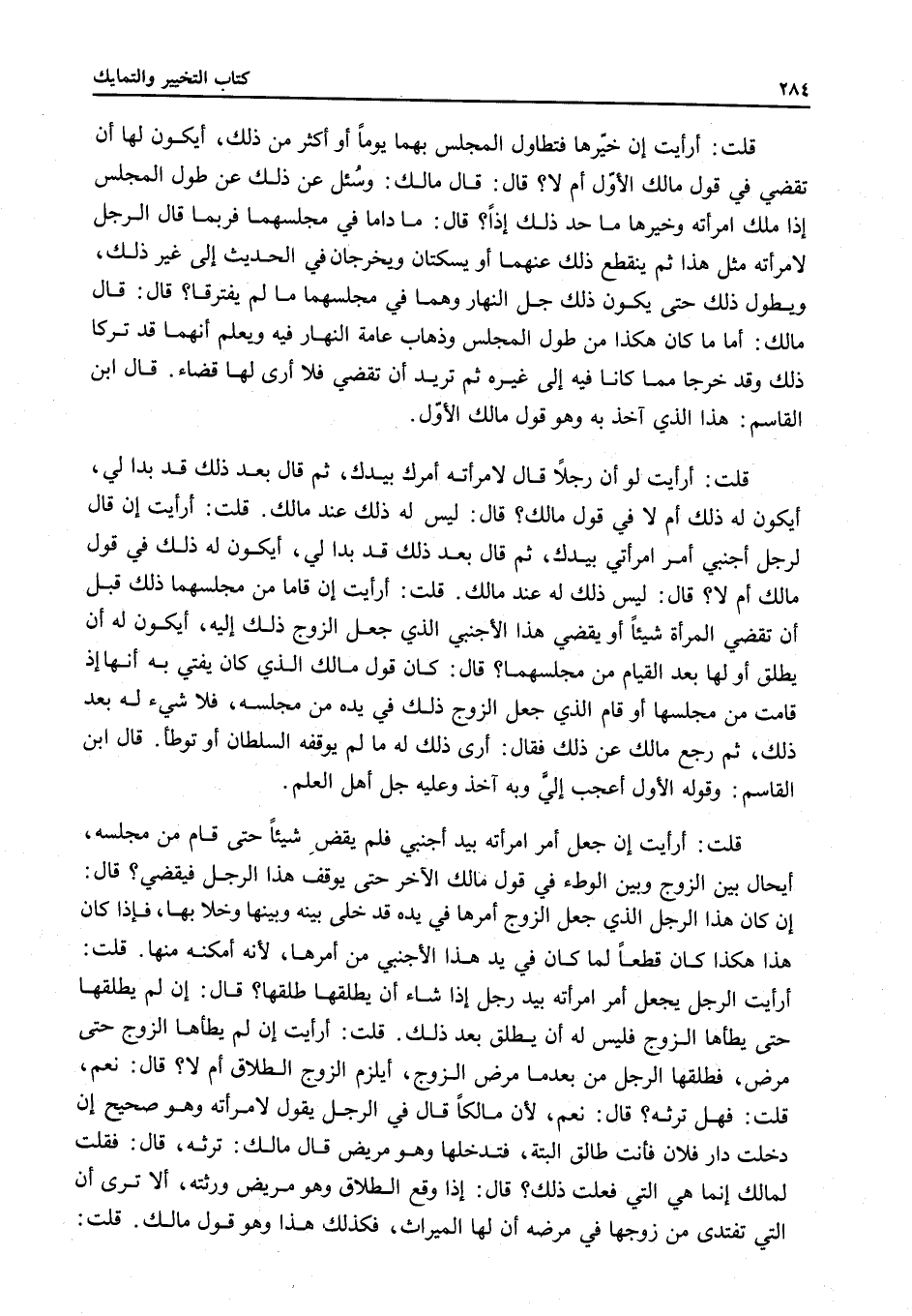 قَالَ: كَانَ قَوْلُ مَالِكٍ الَّذِي كَانَ يُفْتِي بِهِ أَنَّهَا إذَا قَامَتْ مِنْ مَجْلِسِهَا أَوْ قَامَ الَّذِي جَعَلَ الزَّوْجُ ذَلِكَ فِي يَدِهِ مِنْ مَجْلِسِهِ، فَلَا شَيْءَ لَهُ بَعْدَ ذَلِكَ، ثُمَّ رَجَعَ مَالِكٌ عَنْ ذَلِكَ فَقَالَ: أَرَى ذَلِكَ لَهُ مَا لَمْ يُوقِفْهُ السُّلْطَانُ أَوْ تُوطَأْ، قَالَ ابْنُ الْقَاسِمِ: وَقَوْلُهُ الْأَوَّلُ أَعْجَبُ إلَيَّ وَبِهِ آخُذُ وَعَلَيْهِ جُلُّ أَهْلِ الْعِلْمِ