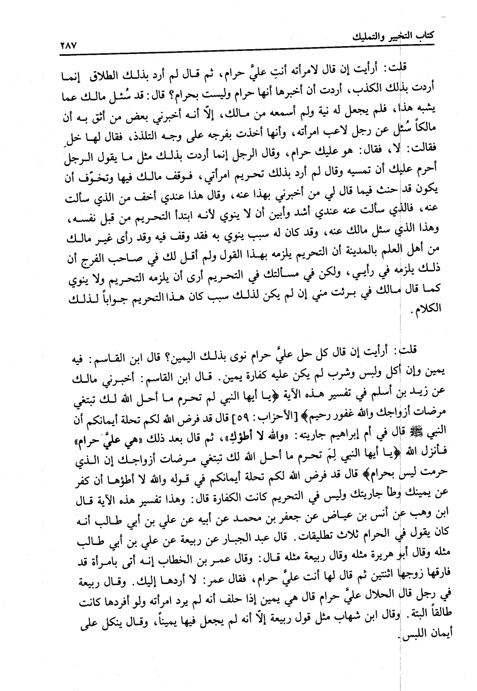قَالَ ابْنُ الْقَاسِمِ: فِيهِ يَمِينٌ وَإِنْ أَكَلَ وَلَبِسَ وَشَرِبَ لَمْ يَكُنْ عَلَيْهِ كَفَّارَةُ يَمِينٍ، قَالَ ابْنُ الْقَاسِمِ: أَخْبَرَنِي مَالِكٌ عَنْ زَيْدِ بْنِ أَسْلَمَ فِي تَفْسِيرِ هَذِهِ الْآيَةِ « {يَا أَيُّهَا النَّبِيُّ لِمَ تُحَرِّمُ مَا أَحَلَّ اللَّهُ لَكَ تَبْتَغِي مَرْضَاتَ أَزْوَاجِكَ وَاللَّهُ غَفُورٌ رَحِيمٌ} [التحريم: 1] {قَدْ فَرَضَ اللَّهُ لَكُمْ تَحِلَّةَ أَيْمَانِكُمْ} [التحريم: 2] أَنَّ النَّبِيَّ - صَلَّى اللَّهُ عَلَيْهِ وَسَلَّمَ - قَالَ فِي أُمِّ إبْرَاهِيمَ جَارِيَتِهِ: وَاَللَّهِ لَا أَطَؤُكِ، ثُمَّ قَالَ بَعْدَ ذَلِكَ هِيَ عَلَيَّ حَرَامٌ فَأَنْزَلَ اللَّهُ {يَا أَيُّهَا النَّبِيُّ لِمَ تُحَرِّمُ مَا أَحَلَّ اللَّهُ لَكَ تَبْتَغِي مَرْضَاتَ أَزْوَاجِكَ} [التحريم: 1] إنَّ الَّذِي حَرَّمْتَ لَيْسَ بِحَرَامٍ، قَالَ {قَدْ فَرَضَ اللَّهُ لَكُمْ تَحِلَّةَ أَيْمَانِكُمْ} [التحريم: 2] فِي قَوْلِهِ وَاَللَّهِ لَا أَطَؤُهَا أَنْ كَفِّرْ عَنْ يَمِينِكَ وَطَأْ جَارِيَتَك وَلَيْسَ فِي التَّحْرِيمِ كَانَتْ الْكَفَّارَةُ» ، قَالَ: وَهَذَا تَفْسِيرُ هَذِهِ الْآيَةِ، قَالَ ابْنُ وَهْبٍ عَنْ أَنَسِ بْنِ عِيَاضٍ عَنْ جَعْفَرِ بْنِ مُحَمَّدٍ عَنْ أَبِيهِ عَنْ عَلِيِّ بْنِ أَبِي طَالِبٍ أَنَّهُ كَانَ يَقُولُ فِي الْحَرَامِ ثَلَاثُ تَطْلِيقَاتٍ.