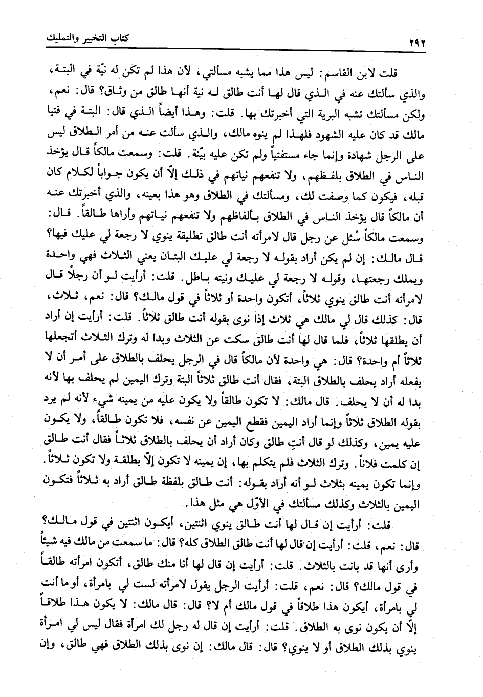 قُلْتُ: وَهَذَا أَيْضًا الَّذِي قَالَ: أَلْبَتَّةَ فِي فُتْيَا مَالِكٍ قَدْ كَانَ عَلَيْهِ الشُّهُودُ فَلِهَذَا لَمْ يَنْوِهِ مَالِكٌ، وَاَلَّذِي سَأَلْتُ عَنْهُ مِنْ أَمْرِ الطَّلَاقِ لَيْسَ عَلَى الرَّجُلِ شَهَادَةٌ وَإِنَّمَا جَاءَ مُسْتَفْتِيًا وَلَمْ تَكُنْ عَلَيْهِ بَيِّنَةٌ.