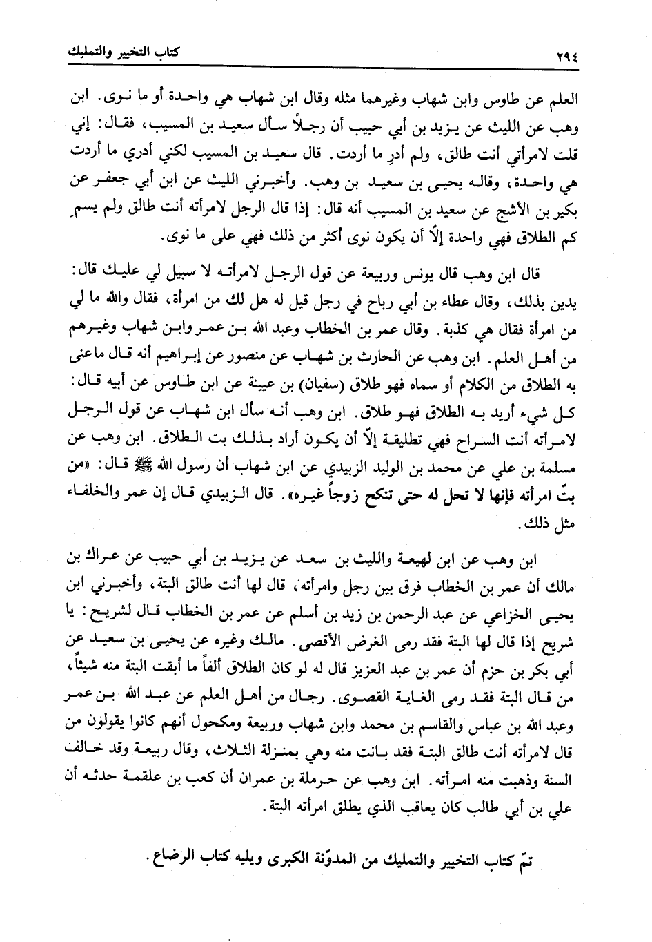 قَالَ ابْنُ وَهْبٍ قَالَ يُونُسُ وَرَبِيعَةُ عَنْ قَوْلِ الرَّجُلِ لِامْرَأَتِهِ لَا سَبِيلَ لِي عَلَيْكِ، قَالَ: يَدِينُ بِذَلِكَ، وَقَالَ عَطَاءُ بْنُ أَبِي رَبَاحٍ فِي رَجُلٍ قِيلَ لَهُ هَلْ لَكَ مِنْ امْرَأَةٍ، فَقَالَ وَاَللَّهِ مَا لِي مِنْ امْرَأَةٍ، فَقَالَ: هِيَ كَذْبَةٌ، وَقَالَ عُمَرُ بْنُ الْخَطَّابِ وَعَبْدُ اللَّهِ بْنُ عُمَرَ وَابْنُ شِهَابٍ وَغَيْرُهُمْ مِنْ أَهْلِ الْعِلْمِ ابْنُ وَهْبٍ عَنْ الْحَارِثِ بْنِ شِهَابٍ عَنْ مَنْصُورٍ عَنْ إبْرَاهِيمَ أَنَّهُ قَالَ مَا عَنَى بِهِ الطَّلَاقَ مِنْ الْكَلَامِ أَوْ سَمَّاهُ فَهُوَ طَلَاقٌ سُفْيَانُ بْنُ عُيَيْنَةَ عَنْ ابْنِ طَاوُسٍ عَنْ أَبِيهِ قَالَ: كُلُّ شَيْءٍ أُرِيدَ بِهِ الطَّلَاقُ فَهُوَ طَلَاقٌ. ابْنُ وَهْبٍ أَنَّهُ سَأَلَ ابْنَ شِهَابٍ عَنْ قَوْلِ الرَّجُلِ لِامْرَأَتِهِ أَنْتِ السَّرَاحُ فَهِيَ تَطْلِيقَةٌ إلَّا أَنْ يَكُونَ أَرَادَ بِذَلِكَ بَتَّ الطَّلَاقِ ابْنُ وَهْبٍ عَنْ مَسْلَمَةَ بْنِ عَلِيٍّ عَنْ مُحَمَّدِ بْنِ الْوَلِيدِ الزُّبَيْدِيِّ عَنْ ابْنِ شِهَابٍ أَنَّ رَسُولَ اللَّهِ - صَلَّى اللَّهُ عَلَيْهِ وَسَلَّمَ - قَالَ: «مَنْ بَتَّ امْرَأَتَهُ فَإِنَّهَا لَا تَحِلُّ لَهُ حَتَّى تَنْكِحَ زَوْجًا غَيْرَهُ» قَالَ الزُّبَيْدِيُّ: قَالَ ابْنُ عُمَرَ وَالْخُلَفَاءُ مِثْلَ ذَلِكَ.