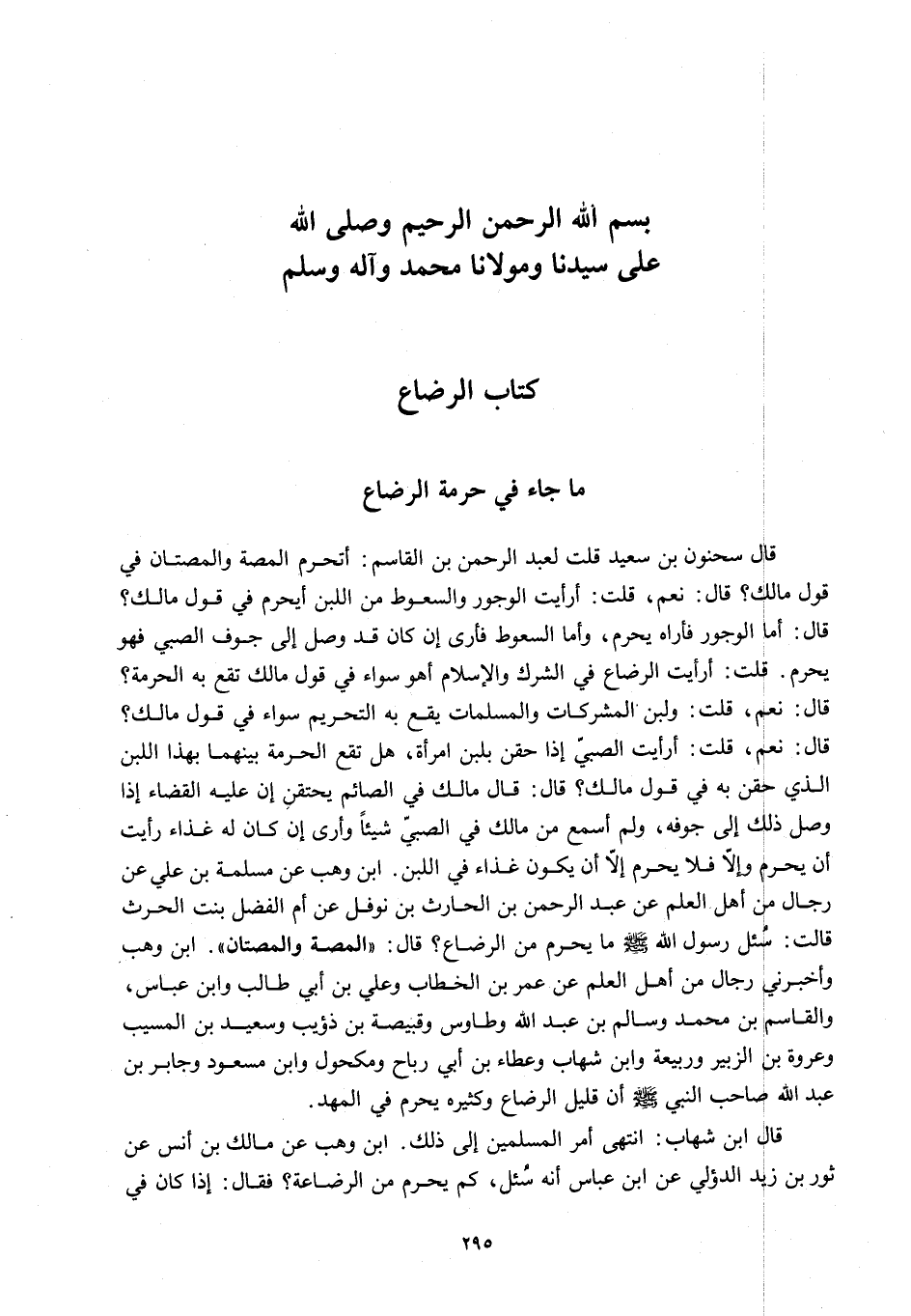 قَالَ: قَالَ مَالِكٌ فِي الصَّائِمِ يَحْتَقِنُ: إنَّ عَلَيْهِ الْقَضَاءَ إذَا وَصَلَ ذَلِكَ إلَى جَوْفِهِ، وَلَمْ أَسْمَعْ مِنْ مَالِكٍ فِي الصَّبِيِّ شَيْئًا وَأَرَى إنْ كَانَ لَهُ غِذَاءً رَأَيْتُ أَنْ يُحَرِّمَ وَإِلَّا فَلَا يُحَرِّمُ إلَّا أَنْ يَكُونَ غِذَاءٌ فِي اللَّبَن ابْنُ وَهْبٍ عَنْ مَسْلَمَةَ بْنِ عَلِيٍّ عَنْ رِجَالٍ مِنْ أَهْلِ الْعِلْمِ عَنْ عَبْدِ الرَّحْمَنِ بْنِ الْحَارِثِ بْنِ نَوْفَلٍ عَنْ أُمِّ الْفَضْلِ بِنْتِ الْحَارِثِ قَالَتْ: «سُئِلَ رَسُولُ اللَّهِ - صَلَّى اللَّهُ عَلَيْهِ وَسَلَّمَ - مَا يُحَرِّمُ مِنْ الرَّضَاعِ؟ قَالَ: الْمَصَّةُ وَالْمَصَّتَانِ» ابْنُ وَهْبٍ وَأَخْبَرَنِي رِجَالٌ مِنْ أَهْلِ الْعِلْمِ عَنْ عُمَرَ بْنِ الْخَطَّابِ وَعَلِيِّ بْنِ أَبِي طَالِبٍ وَابْنِ عَبَّاسٍ وَالْقَاسِمِ بْنِ مُحَمَّدٍ وَسَالِمِ بْنِ عَبْدِ اللَّهِ وَطَاوُسٍ وَقَبِيصَةَ بْنِ ذُؤَيْبٍ وَسَعِيدِ بْنِ الْمُسَيِّبِ وَعُرْوَةَ بْنِ الزُّبَيْرِ وَرَبِيعَةَ وَابْنِ شِهَابٍ وَعَطَاءِ بْنِ أَبِي رَبَاحٍ وَمَكْحُولٍ وَابْنِ مَسْعُودٍ وَجَابِرِ بْنِ عَبْدِ اللَّهِ صَاحِبِ النَّبِيِّ - صَلَّى اللَّهُ عَلَيْهِ وَسَلَّمَ - أَنَّ قَلِيلَ الرَّضَاعِ وَكَثِيرَهُ يُحَرِّمُ فِي الْمَهْدِ، قَالَ ابْنُ شِهَابٍ: انْتَهَى أَمْرُ الْمُسْلِمِينَ إلَى ذَلِكَ ابْنُ وَهْبٍ عَنْ مَالِكِ بْنِ أَنَسٍ عَنْ ثَوْرِ بْنِ زَيْدٍ الدِّيلِيِّ عَنْ ابْنِ عَبَّاسٍ أَنَّهُ سُئِلَ، كَمْ يُحَرِّمُ مِنْ الرَّضَاعَةِ؟ فَقَالَ: إذَا كَانَ فِي