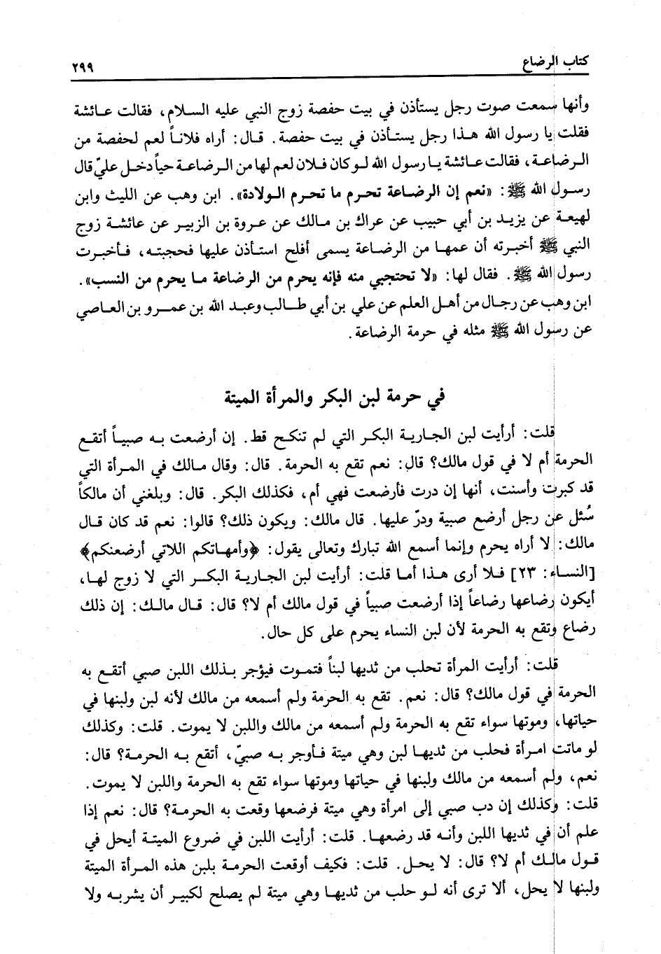 وَأَنَّهَا سَمِعْتُ صَوْتَ رَجُلٍ يَسْتَأْذِنُ فِي بَيْتِ حَفْصَةَ زَوْجِ النَّبِيِّ - عَلَيْهِ السَّلَامُ -، فَقَالَتْ عَائِشَةُ فَقُلْتُ يَا رَسُولَ اللَّهِ هَذَا رَجُلٌ يَسْتَأْذِنُ فِي بَيْتِ حَفْصَةَ، قَالَ: أَرَاهُ فُلَانًا لِعَمٍّ لِحَفْصَةَ مِنْ الرَّضَاعَةِ، فَقَالَتْ عَائِشَةُ يَا رَسُولَ اللَّهِ لَوْ كَانَ فُلَانٌ لِعَمٍّ لَهَا مِنْ الرَّضَاعَةِ حَيًّا دَخَلَ عَلَيَّ، قَالَ رَسُولُ اللَّهِ - صَلَّى اللَّهُ عَلَيْهِ وَسَلَّمَ -: نَعَمْ إنَّ الرَّضَاعَةَ تُحَرِّمُ مَا تُحَرِّمُ الْوِلَادَةُ» ابْنُ وَهْبٍ عَنْ اللَّيْثِ وَابْنِ لَهِيعَةَ عَنْ يَزِيدَ بْنِ أَبِي حَبِيبٍ عَنْ عِرَاكِ بْنِ مَالِكٍ عَنْ عُرْوَةَ بْنِ الزُّبَيْرِ عَنْ عَائِشَةَ زَوْجِ النَّبِيِّ - صَلَّى اللَّهُ عَلَيْهِ وَسَلَّمَ - أَخْبَرَتْهُ أَنَّ عَمَّهَا مِنْ الرَّضَاعَةِ يُسَمَّى أَفْلَحَ اسْتَأْذَنَ عَلَيْهَا فَحَجَبَتْهُ، فَأَخْبَرَتْ رَسُولَ اللَّهِ - صَلَّى اللَّهُ عَلَيْهِ وَسَلَّمَ - فَقَالَ لَهَا: «لَا تَحْتَجِبِي مِنْهُ فَإِنَّهُ يَحْرُمُ مِنْ الرَّضَاعَةِ مَا يَحْرُمُ مِنْ النَّسَبِ»