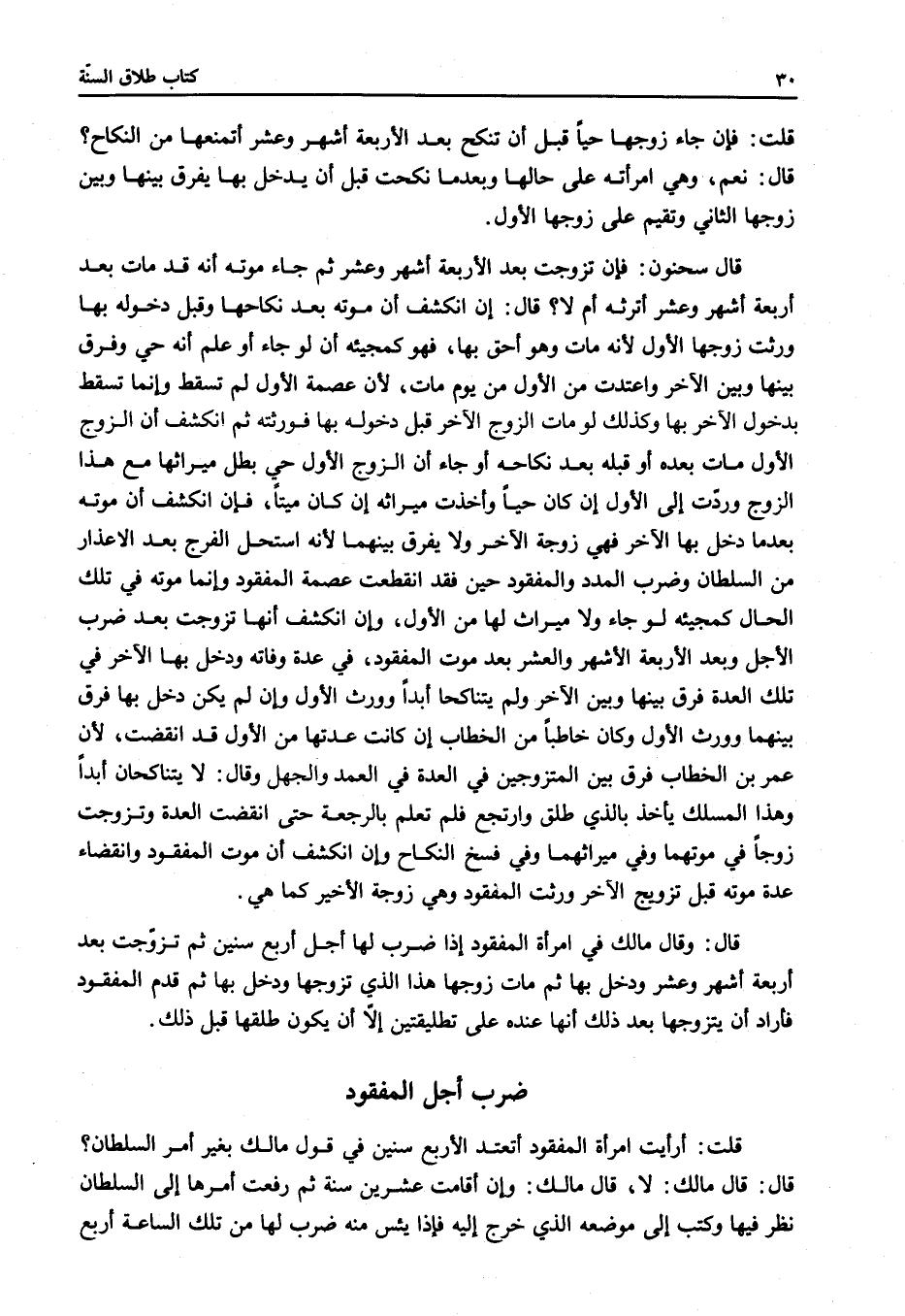 ِ قُلْتُ: أَرَأَيْتَ امْرَأَةَ الْمَفْقُودِ أَتَعْتَدُّ الْأَرْبَعَ سِنِينَ فِي قَوْلِ مَالِكٍ بِغَيْرِ أَمْرِ السُّلْطَانِ؟