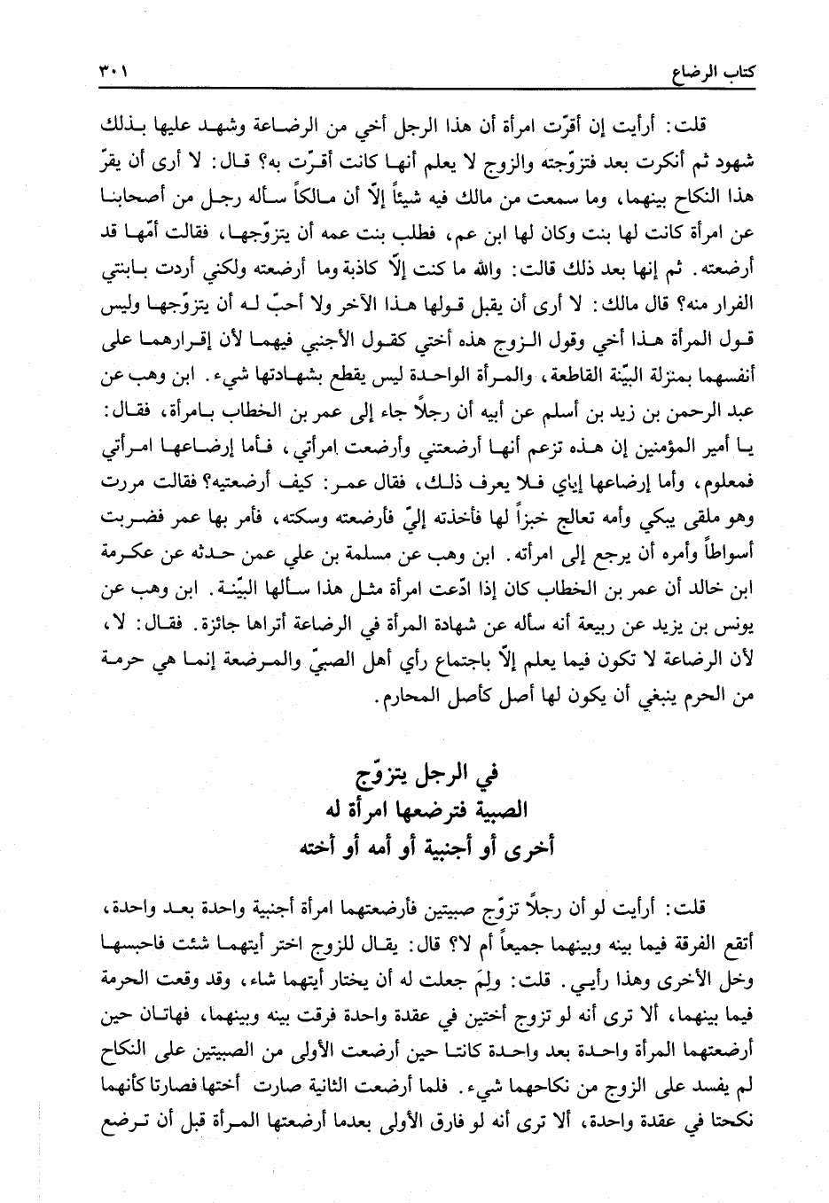 قُلْتُ: أَرَأَيْتَ لَوْ أَنَّ رَجُلًا تَزَوَّجَ صَبِيَّتَيْنِ فَأَرْضَعَتْهُمَا امْرَأَةٌ أَجْنَبِيَّةٌ وَاحِدَةً بَعْدَ وَاحِدَةٍ أَتَقَعُ الْفُرْقَةُ فِيمَا بَيْنَهُ وَبَيْنَهُمَا جَمِيعًا أَمْ لَا؟