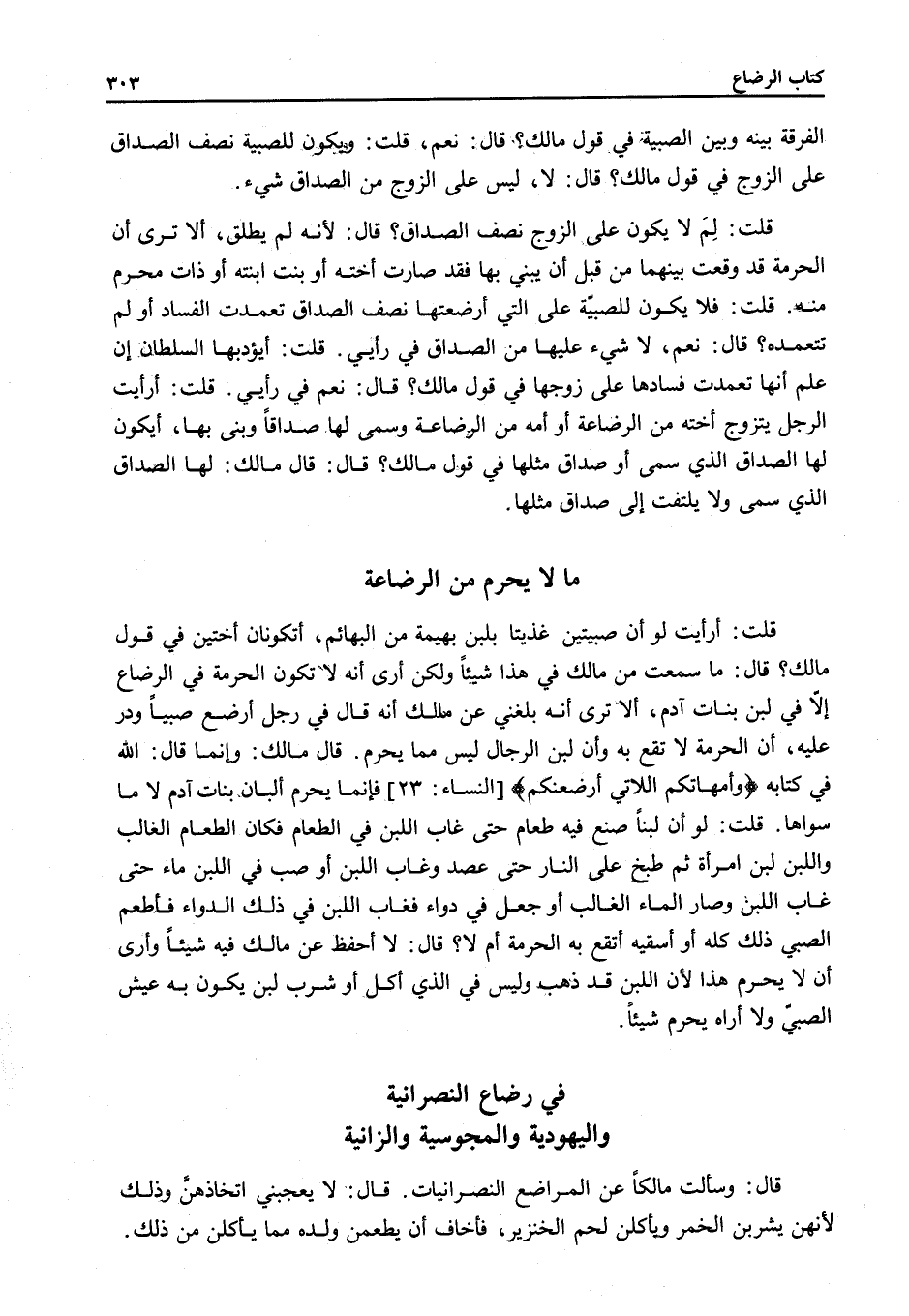 فِي رَضَاعِ النَّصْرَانِيَّةِ وَالْيَهُودِيَّةِ وَالْمَجُوسِيَّةِ وَالزَّانِيَةِ قَالَ: وَسَأَلْتُ مَالِكًا عَنْ الْمَرَاضِعِ النَّصْرَانِيَّاتِ.