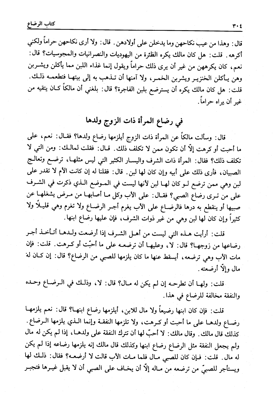 فِي رَضَاعِ الْمَرْأَةِ ذَاتِ الزَّوْجِ وَلَدَهَا قَالَ: وَسَأَلْتُ مَالِكًا عَنْ الْمَرْأَةِ ذَاتِ الزَّوْجِ أَيَلْزَمُهَا رَضَاعُ وَلَدِهَا؟ فَقَالَ: نَعَمْ، عَلَى مَا أَحَبَّتْ أَوْ كَرِهَتْ إلَّا أَنْ تَكُونَ مِمَّنْ لَا تُكَلَّفُ ذَلِكَ.