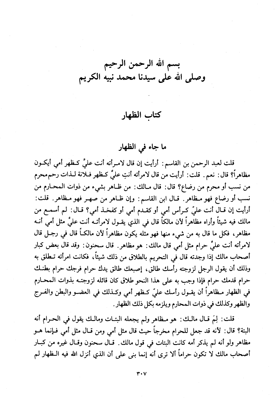 مَا جَاءَ فِي الظِّهَارِ قُلْتُ لِعَبْدِ الرَّحْمَنِ بْنِ الْقَاسِمِ: أَرَأَيْتَ إنْ قَالَ لِامْرَأَتِهِ أَنْتِ عَلَيَّ كَظَهْرِ أُمِّي أَيَكُونُ مُظَاهِرًا؟