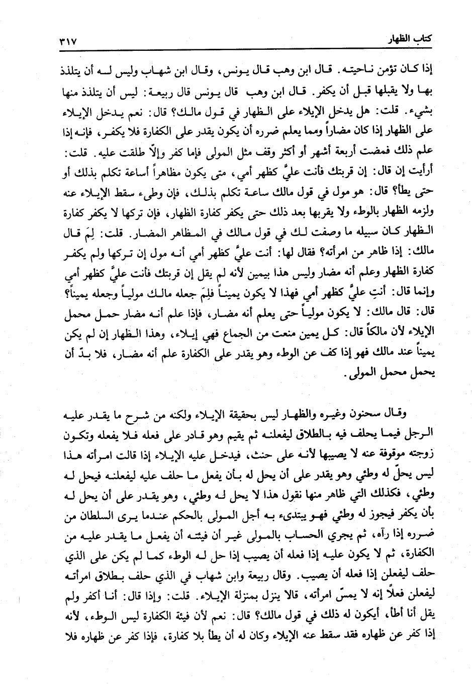 وَقَالَ سَحْنُونٌ وَغَيْرُهُ: وَالظِّهَارُ لَيْسَ بِحَقِيقَةِ الْإِيلَاءِ وَلَكِنَّهُ مِنْ شَرْحِ مَا يَقْدِرُ عَلَيْهِ الرَّجُلُ فِيمَا يَحْلِفُ فِيهِ بِالطَّلَاقِ لَيَفْعَلَنَّهُ، ثُمَّ يُقِيمُ وَهُوَ قَادِرٌ عَلَى فِعْلِهِ فَلَا يَفْعَلُهُ وَتَكُونُ زَوْجَتُهُ مَوْقُوفَةً عَنْهُ لَا يُصِيبُهَا لِأَنَّهُ عَلَى حِنْثٍ، فَيَدْخُلُ عَلَيْهِ الْإِيلَاءُ إذَا قَالَتْ امْرَأَتُهُ هَذَا لَيْسَ يَحِلُّ لَهُ وَطْئِي وَهُوَ يَقْدِرُ عَلَى أَنْ يَحِلَّ لَهُ بِأَنْ يَفْعَلَ مَا حَلَفَ عَلَيْهِ لَيَفْعَلَنَّهُ فَيَحِلُّ لَهُ وَطْئِي، فَكَذَلِكَ الَّتِي ظَاهَرَ مِنْهَا تَقُولُ هَذَا لَا يَحِلُّ لَهُ وَطْئِي، وَهُوَ يَقْدِرُ عَلَى أَنْ يَحِلَّ لَهُ بِأَنْ يُكَفِّرَ فَيَجُوزَ لَهُ وَطْئِي فَهُوَ يَبْتَدِئُ بِهِ أَجَلَ الْمُولِي بِالْحُكْمِ عِنْدَمَا يَرَى السُّلْطَانُ مِنْ ضَرَرِهِ إذَا رَآهُ، ثُمَّ يَجْرِي الْحِسَابُ بِالْمُولِي غَيْرَ أَنَّ فَيْئَتَهُ أَنْ يَفْعَلَ مَا يَقْدِرُ عَلَيْهِ مِنْ الْكَفَّارَةِ، ثُمَّ لَا يَكُونُ عَلَيْهِ إذَا فَعَلَهُ أَنْ يُصِيبَ إذَا حَلَّ لَهُ الْوَطْءُ كَمَا لَمْ يَكُنْ عَلَى الَّذِي حَلَفَ لَيَفْعَلَنَّ إذَا فَعَلَهُ أَنْ يُصِيبَ.