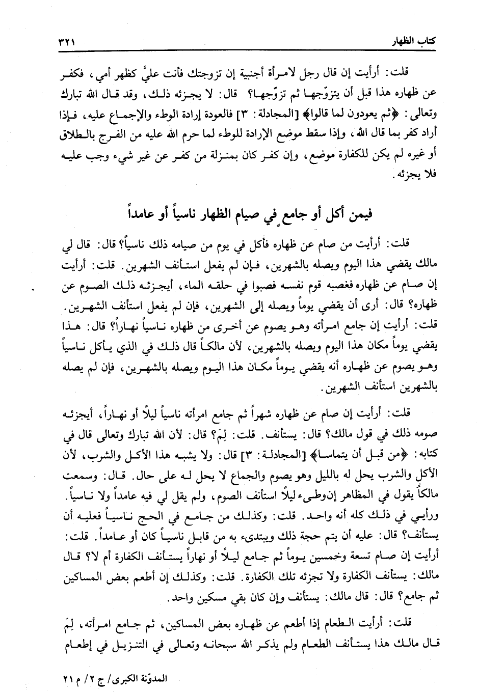 فِيمَنْ أَكَلَ أَوْ جَامَعَ فِي صِيَامِ الظِّهَارِ نَاسِيًا أَوْ عَامِدًا قُلْتُ: أَرَأَيْتَ مَنْ صَامَ عَنْ ظِهَارِهِ فَأَكَلَ فِي يَوْمٍ مِنْ صِيَامِهِ ذَلِكَ نَاسِيًا؟