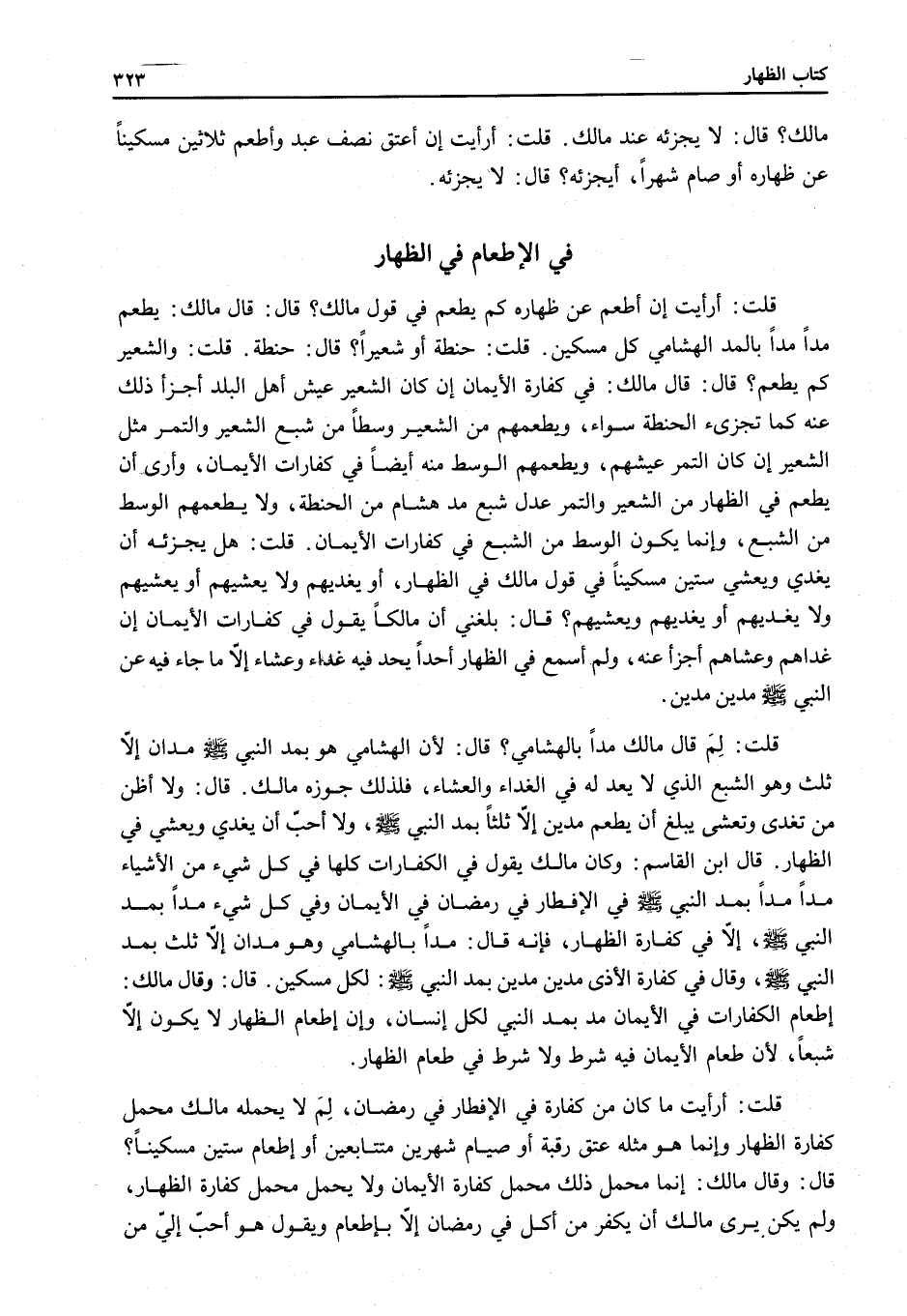قَالَ ابْنُ الْقَاسِمِ: وَكَانَ مَالِكٌ يَقُولُ فِي الْكَفَّارَاتِ كُلِّهَا فِي كُلِّ شَيْءٍ مِنْ الْأَشْيَاءِ مُدًّا مُدًّا بِمُدِّ النَّبِيِّ - صَلَّى اللَّهُ عَلَيْهِ وَسَلَّمَ - فِي الْإِفْطَارِ فِي رَمَضَانَ فِي الْأَيْمَانِ وَفِي كُلِّ شَيْءٍ مُدًّا بِمُدِّ النَّبِيِّ - صَلَّى اللَّهُ عَلَيْهِ وَسَلَّمَ - إلَّا فِي كَفَّارَةِ الظِّهَارِ، فَإِنَّهُ قَالَ: مُدًّا بِالْهِشَامِيِّ وَهُوَ مُدَّانِ إلَّا ثُلُثًا بِمُدِّ النَّبِيِّ - صَلَّى اللَّهُ عَلَيْهِ وَسَلَّمَ -، وَقَالَ فِي كَفَّارَةِ الْأَذَى مُدَّيْنِ مُدَّيْنِ بِمُدِّ النَّبِيِّ - صَلَّى اللَّهُ عَلَيْهِ وَسَلَّمَ -: لِكُلِّ مِسْكِينٍ.